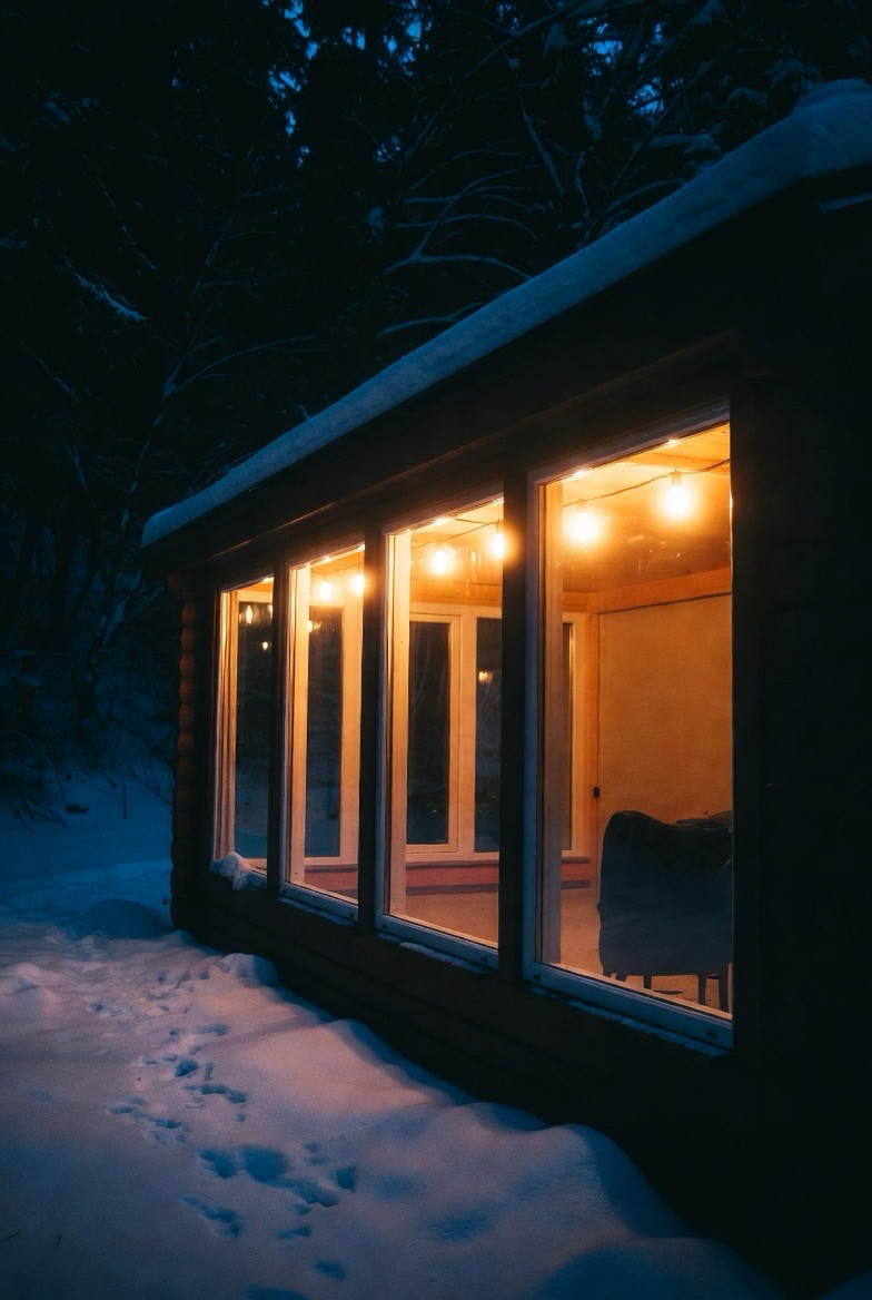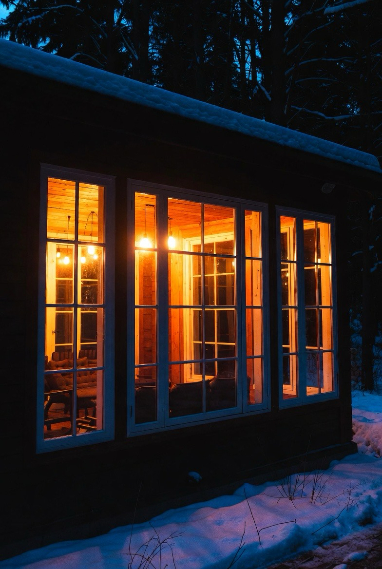 Large windows allow warm interior light to spill out, instantly making a winter cabin feel cozy from the outside. Even simple window designs become inviting when illuminated during winter evenings. Add warm bulbs inside and simple trim outside to frame the glow. This contrast between cold outdoor air and warm indoor light creates one of the most comforting winter visuals possible.