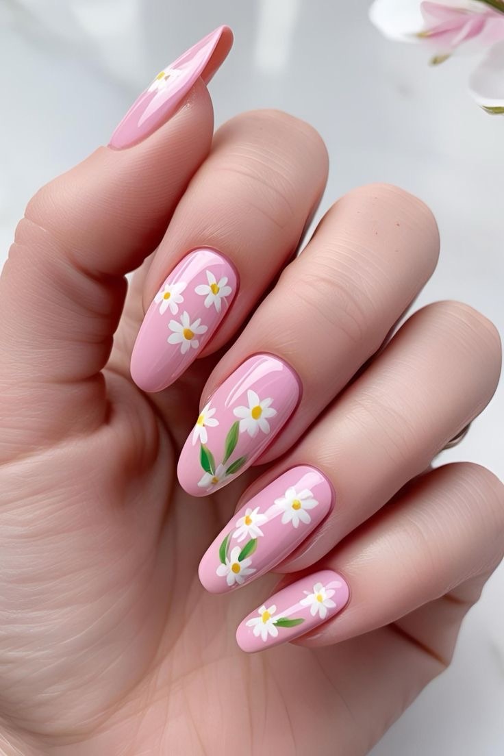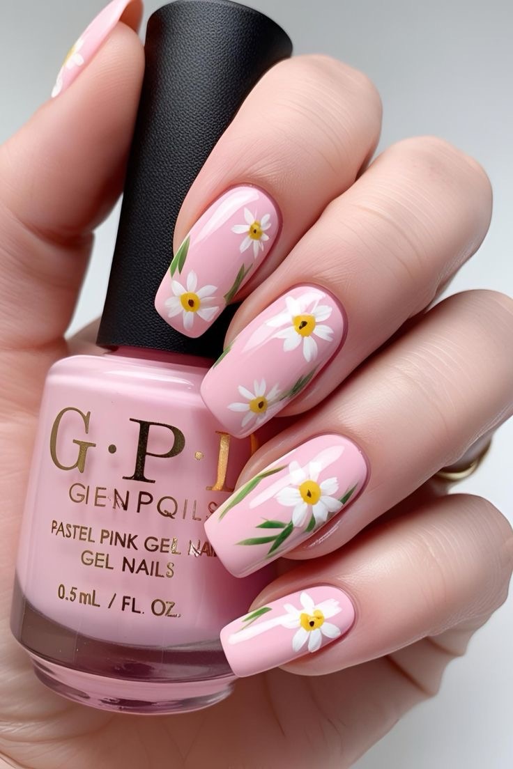 Pastel pink gel nails glow—soft pink polish blooms with tiny white flowers; apply a glossy gel topcoat, hand-paint floral accents, and create a fresh, springtime look.