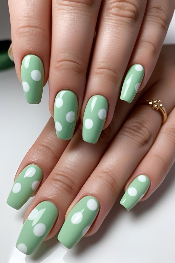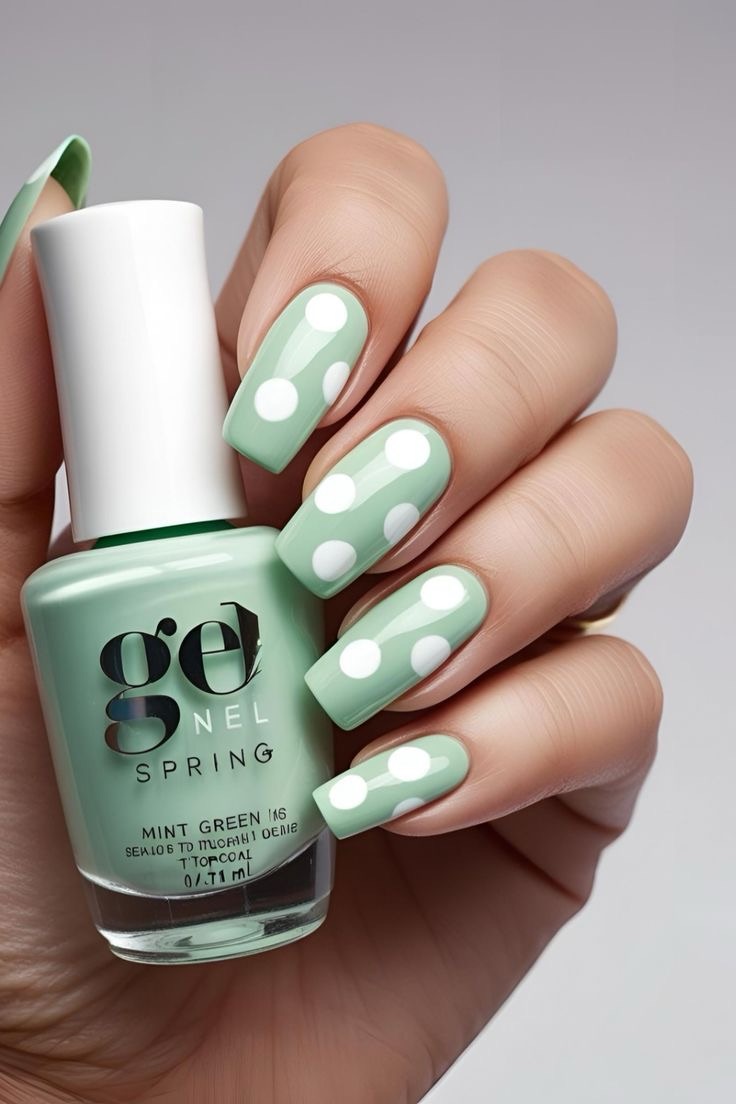 Mint green gel nails shine—light green polish dots with white polka dots; use a dotting tool, seal with gel topcoat, and craft a playful, spring-inspired manicure.