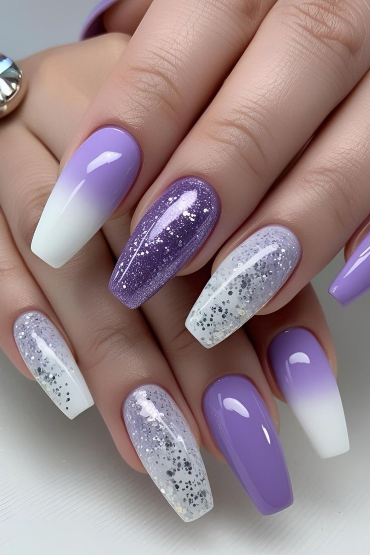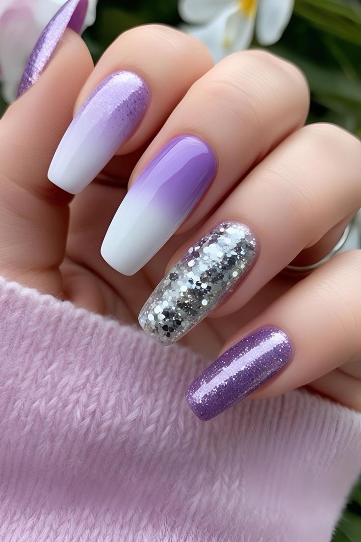 Lavender ombré gel nails dazzle—pale purple fades into white with glitter tips; blend with a sponge, add silver glitter, and create a dreamy, springtime nail design.