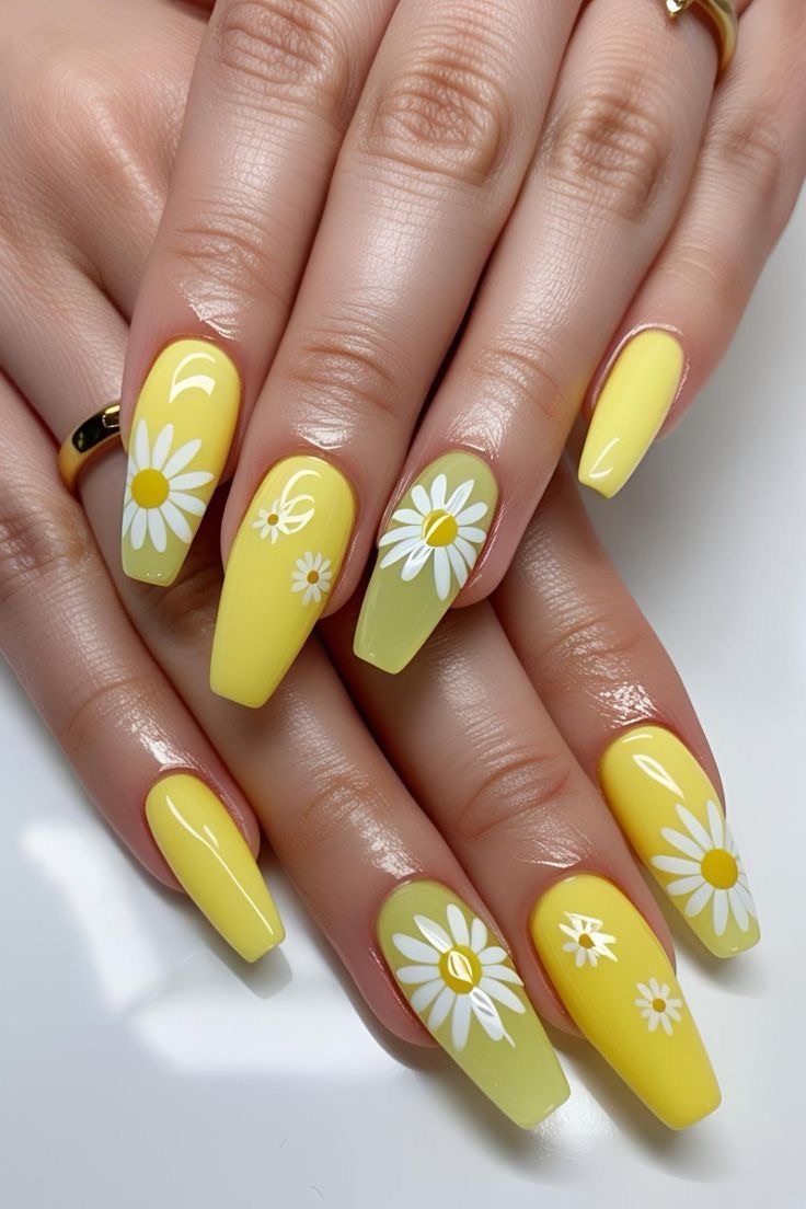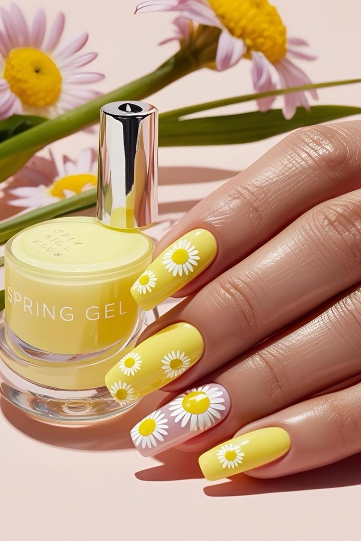Soft yellow gel nails bloom—pale yellow polish glows with daisy decals; apply the base, add decals, seal with gel, and craft a sunny, spring-ready look.