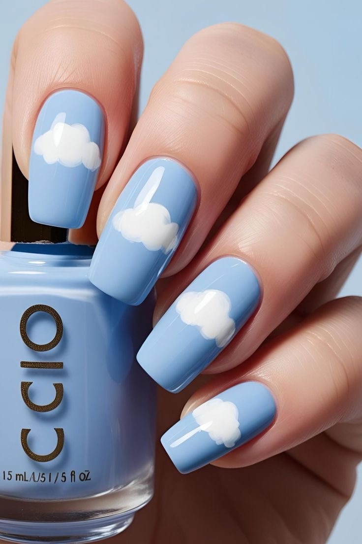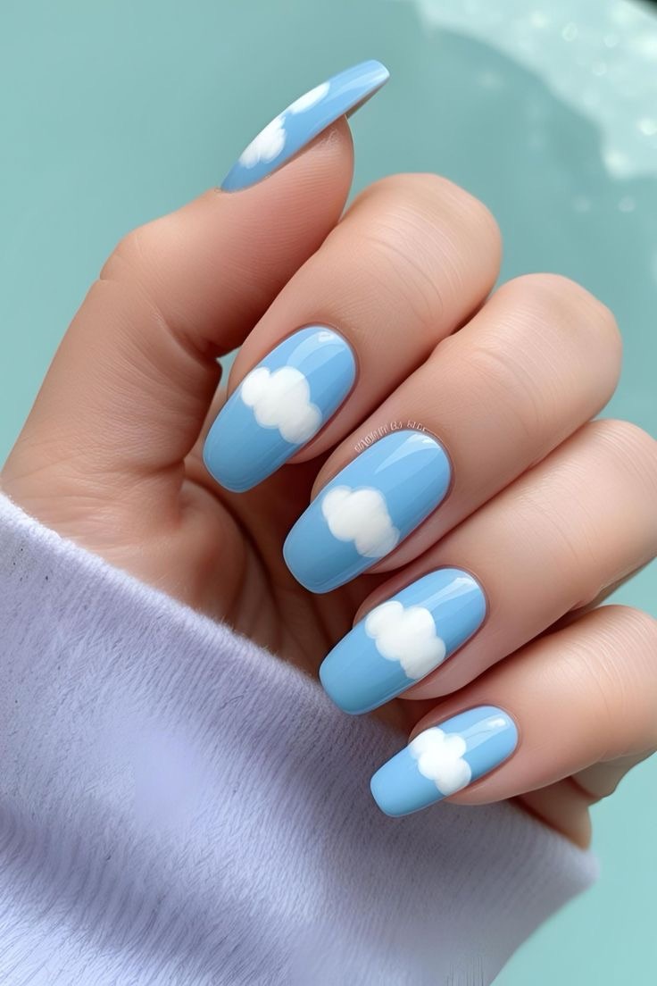 Baby blue gel nails glow—light blue polish features fluffy white clouds; hand-paint clouds, use a glossy gel topcoat, and create a whimsical, spring-sky manicure.