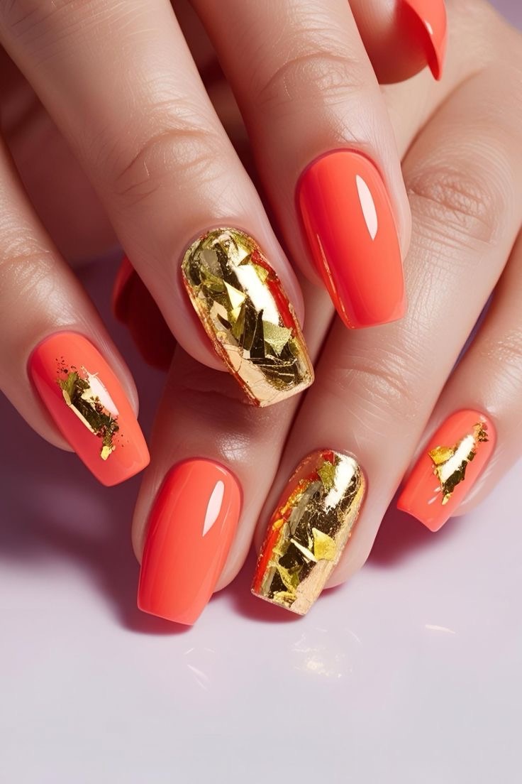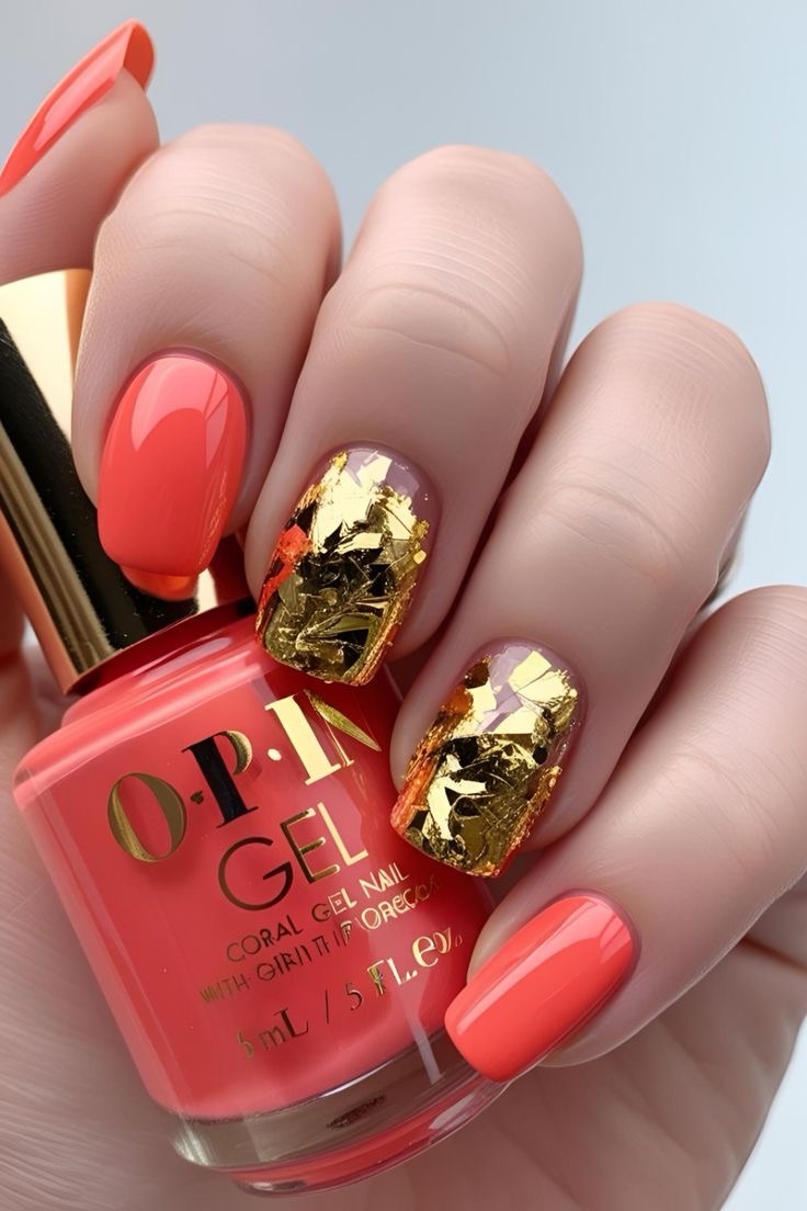 Coral gel nails shine—bright coral polish gleams with gold foil; apply foil flakes, seal with gel topcoat, and craft a vibrant, spring-inspired nail design.