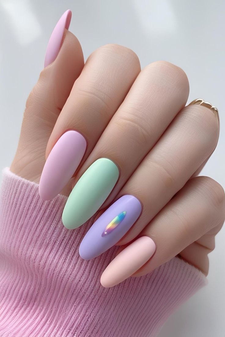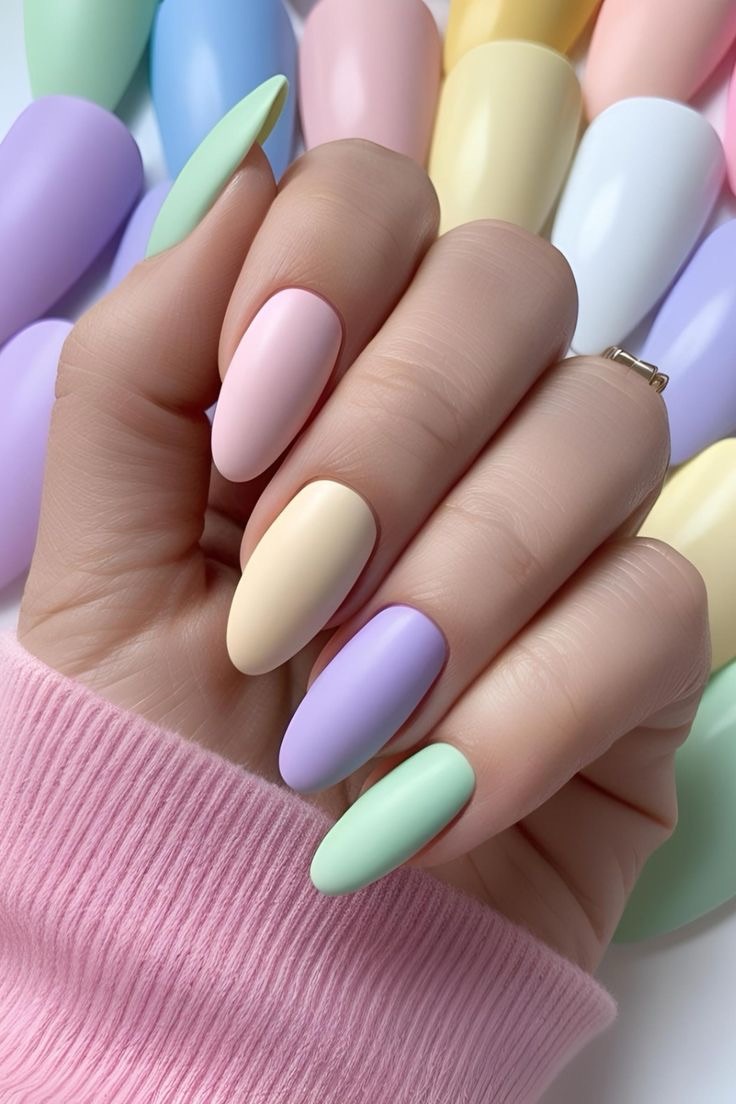 Pastel rainbow gel nails dazzle—each nail a different pastel shade; use a matte gel topcoat, keep it simple, and create a colorful, springtime look.