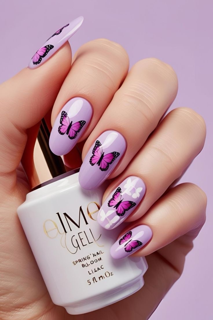 Lilac gel nails bloom—soft purple polish glows with butterfly stickers; apply the base, add stickers, seal with gel, and craft a delicate, spring-ready manicure.