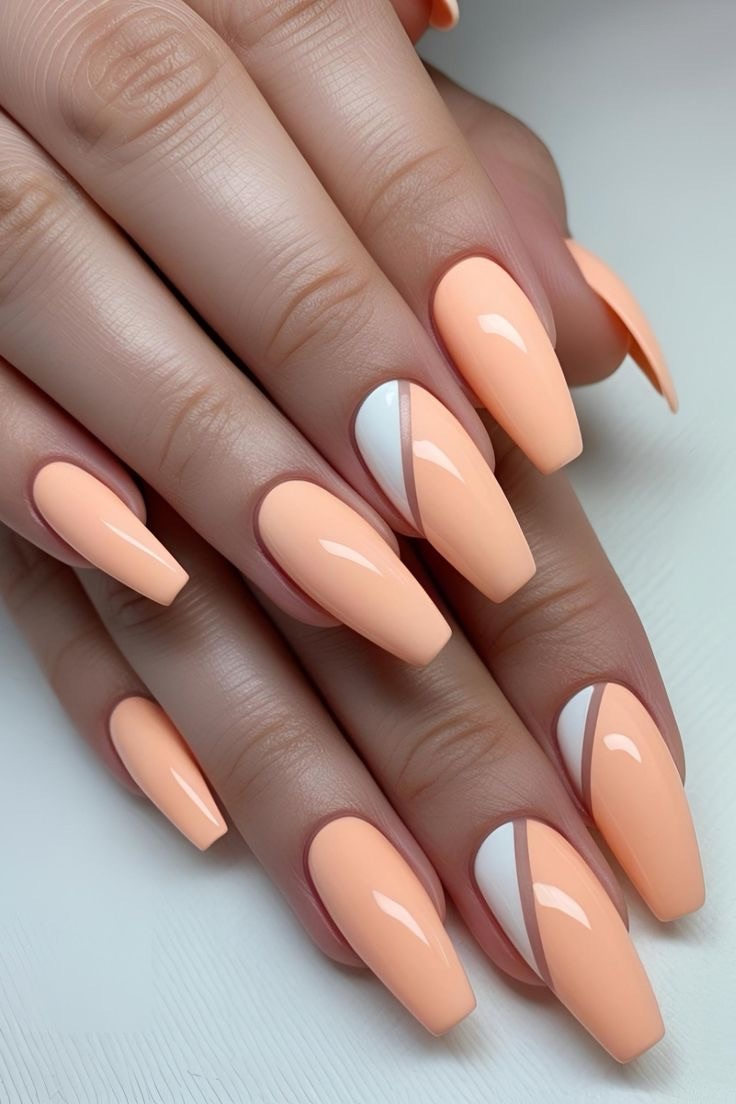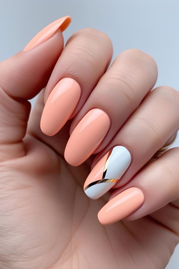 Peach gel nails glow—soft peach polish fills a negative space design; paint half the nail, leave a geometric gap, and create a modern, spring-inspired look.