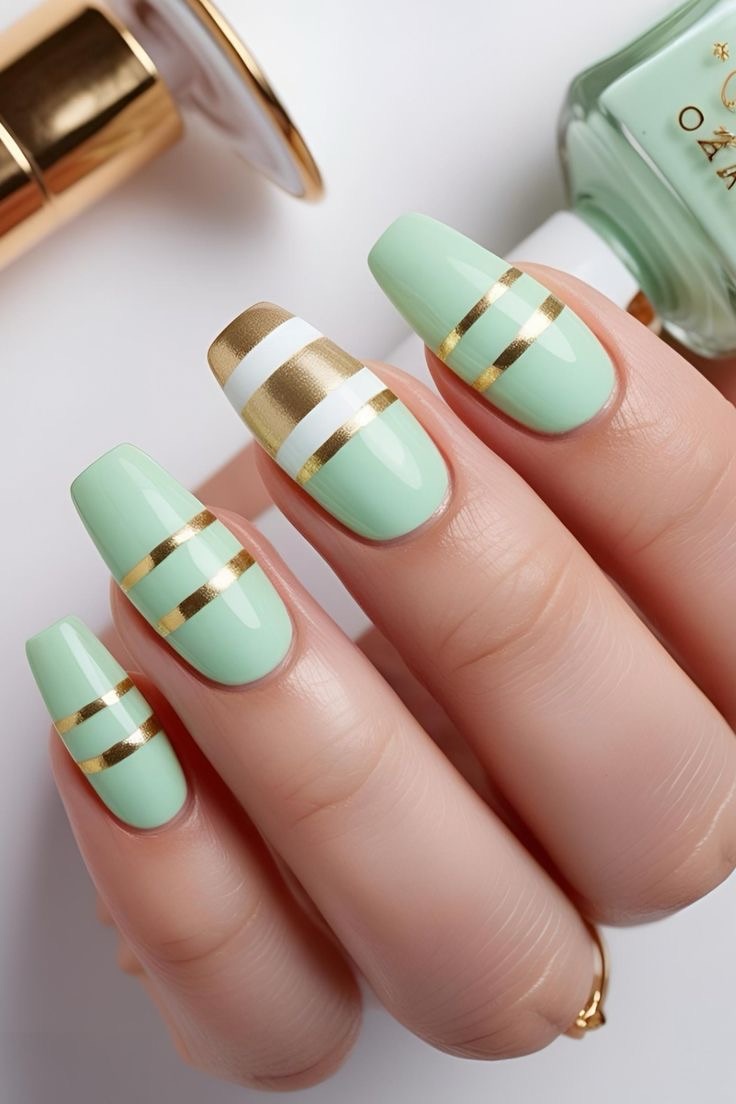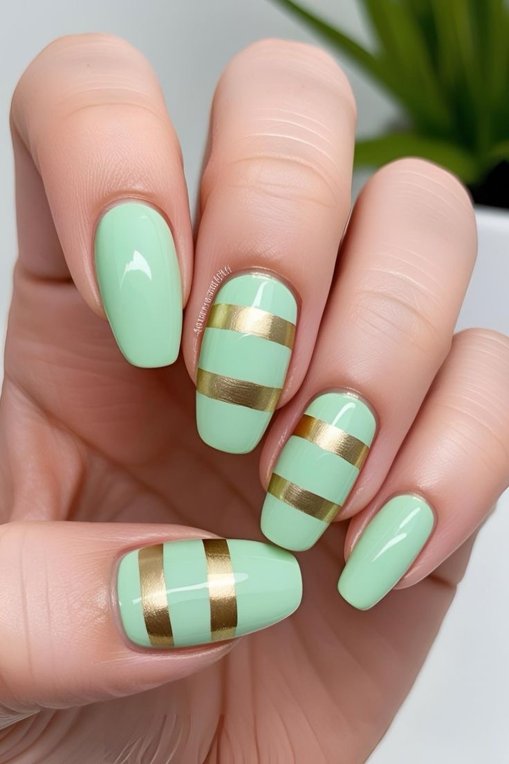 Mint green gel nails shine—light green polish meets gold stripes; use a striping brush, seal with gel topcoat, and craft a chic, springtime nail design.
