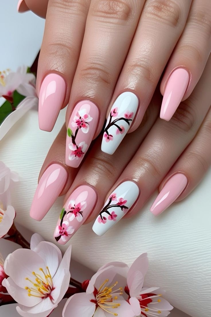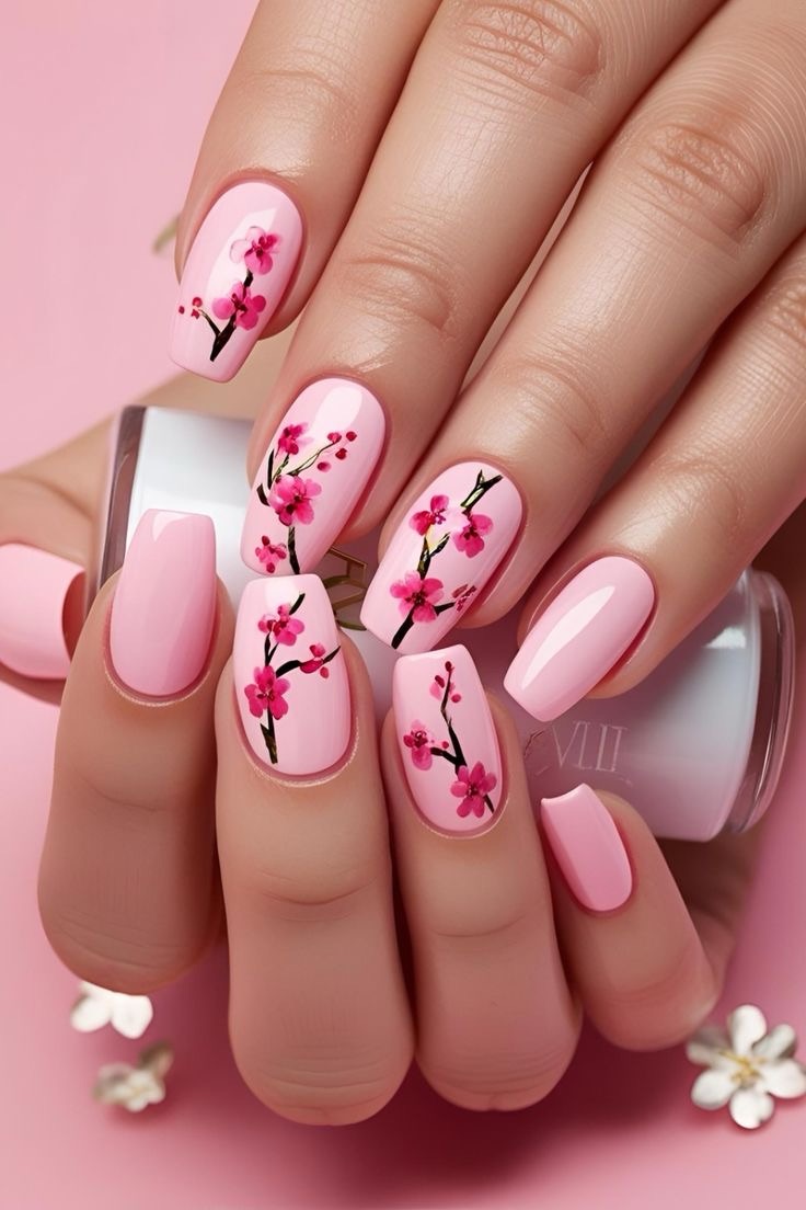 Soft pink gel nails dazzle—pale pink polish blooms with cherry blossoms; hand-paint blossoms, add a glossy gel topcoat, and create a floral, spring-ready look.