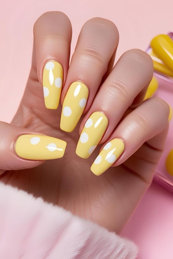 Pastel yellow gel nails glow—pale yellow polish dots with white polka dots; use a dotting tool, seal with gel, and craft a playful, spring-inspired manicure.