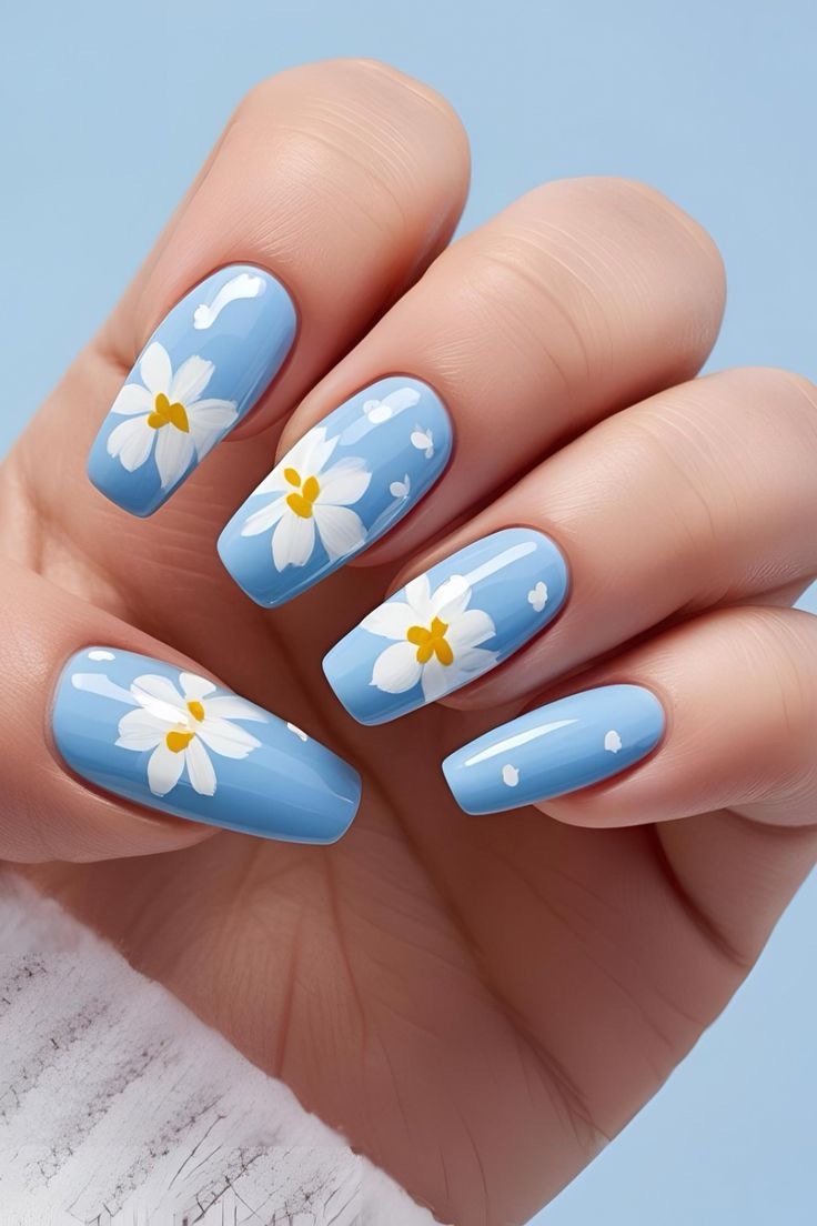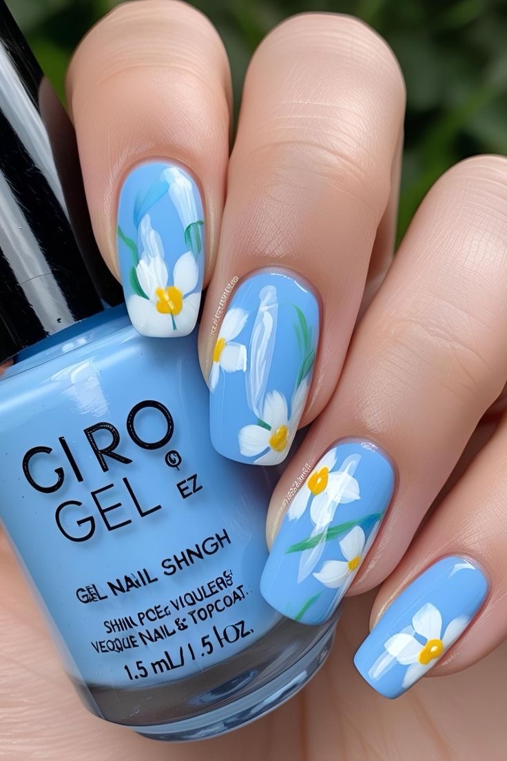 Sky blue gel nails shine—light blue polish features floral patterns; hand-paint white flowers, seal with gel topcoat, and create a fresh, springtime nail design.