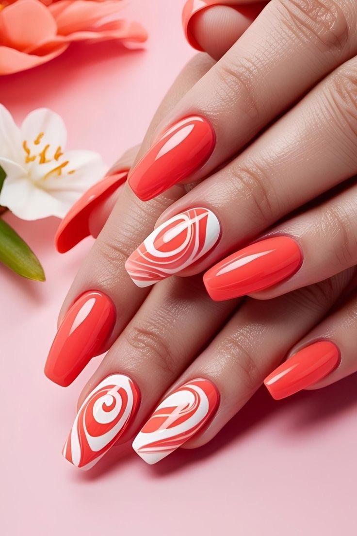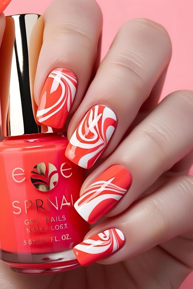 Coral gel nails bloom—bright coral polish swirls with white accents; use a fine brush for swirls, seal with gel, and craft a vibrant, spring-ready look.