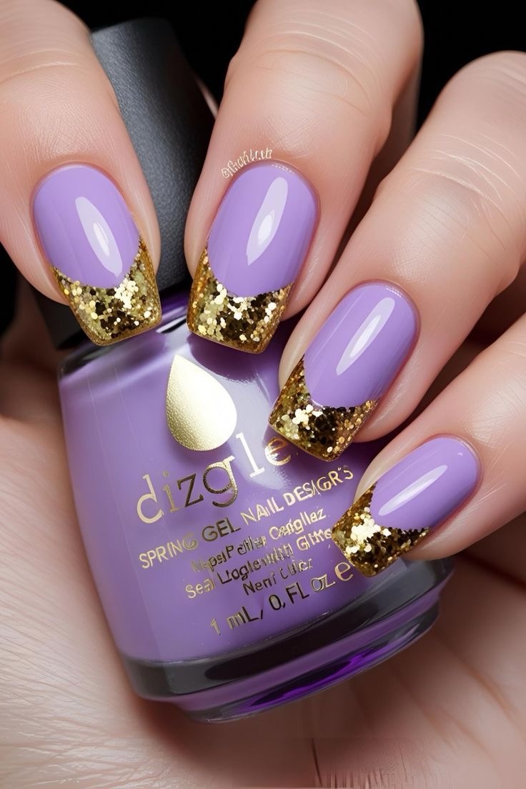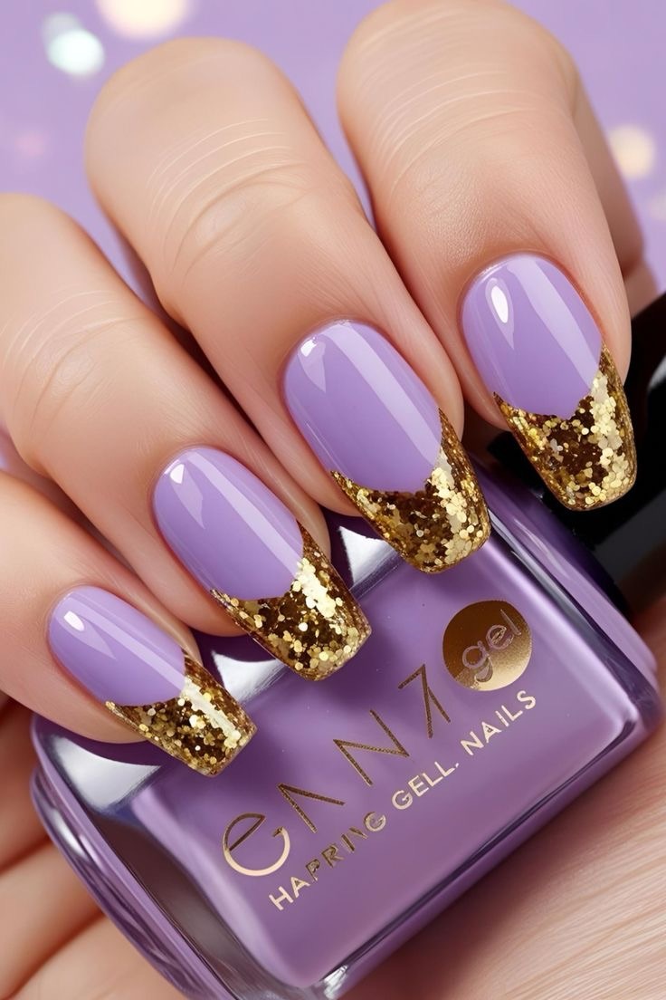 Lavender gel nails dazzle—soft purple polish glows with gold glitter tips; apply glitter, seal with gel topcoat, and create a sparkling, spring-inspired manicure.