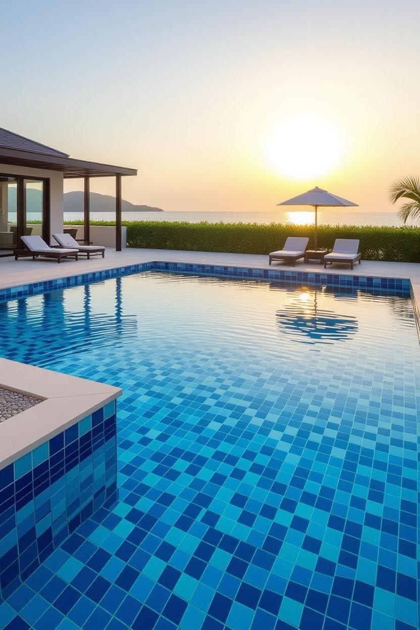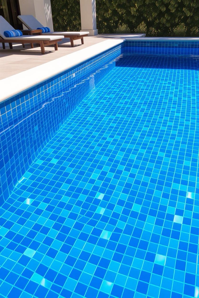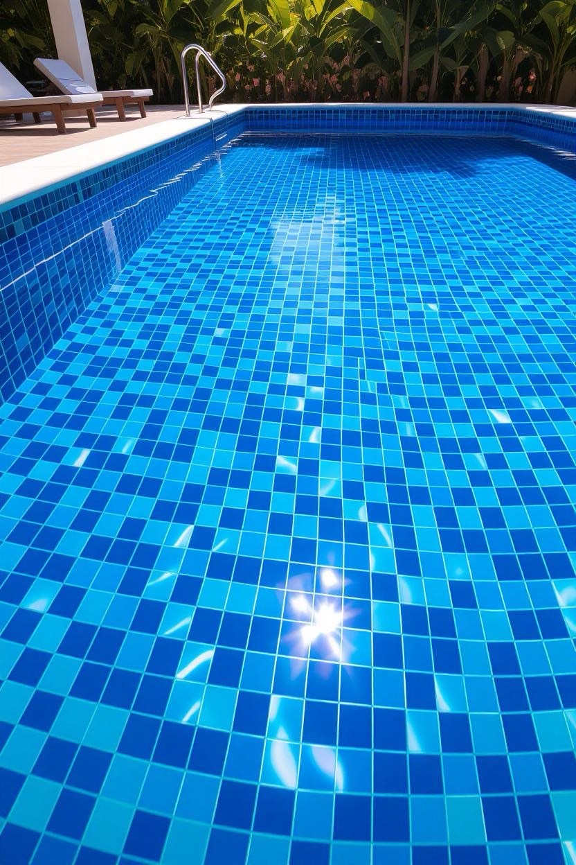 The timeless beauty of blue mosaic tiles creates a sparkling ocean-like effect in your pool. Their shimmering tones reflect light beautifully, making the water appear more vibrant and inviting.