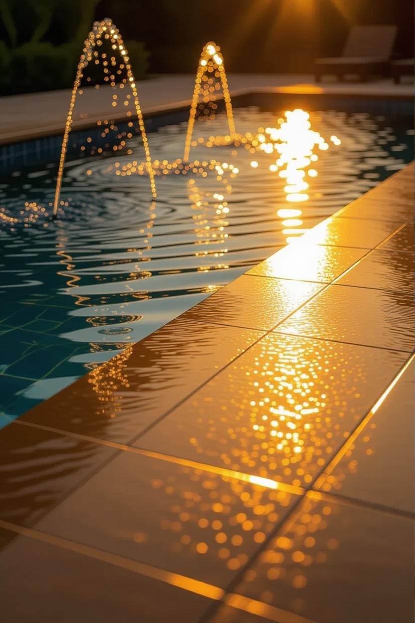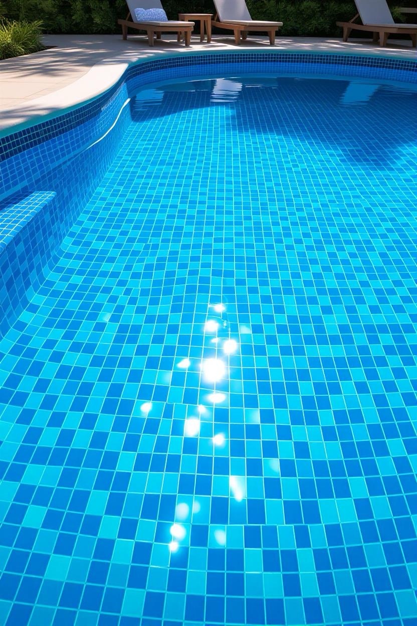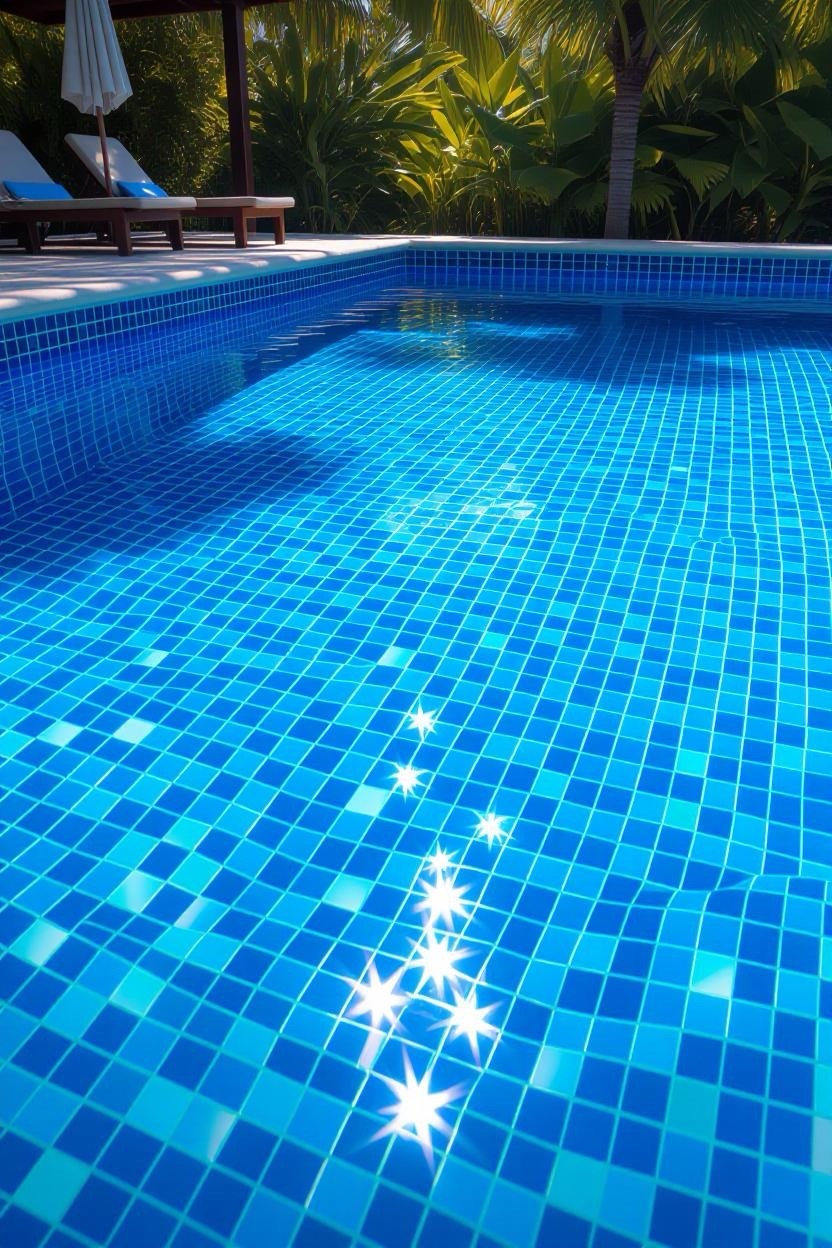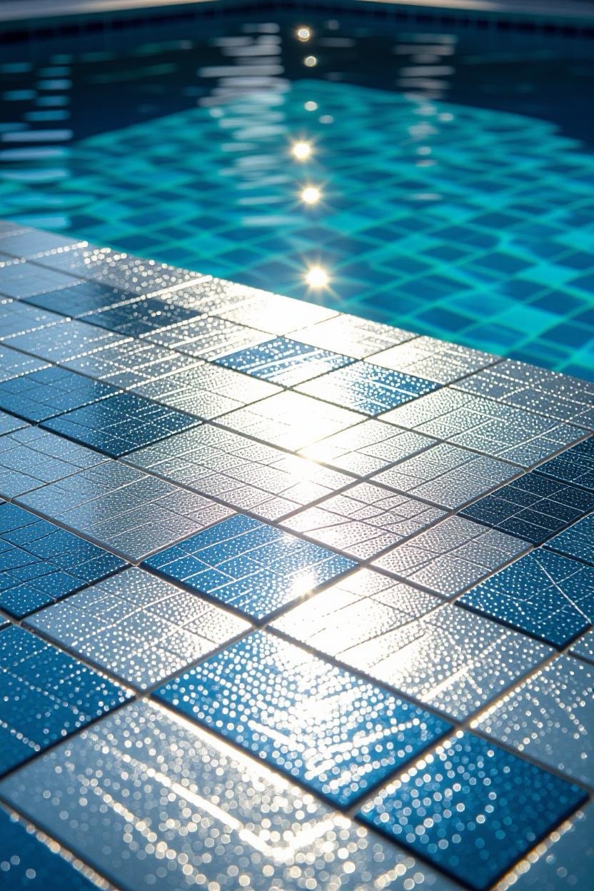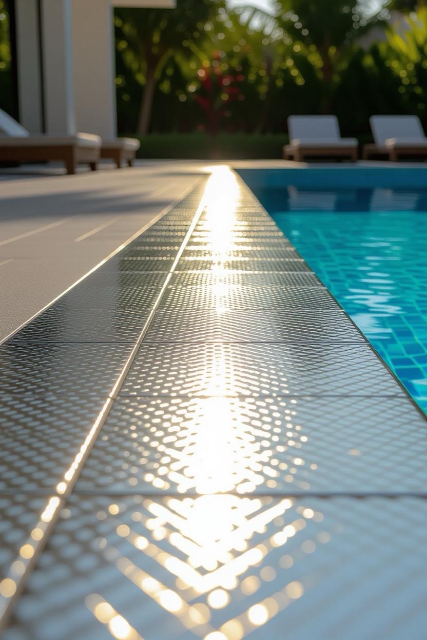 Metallic or reflective tiles bring a luxe shine to your pool, especially under sunlight or pool lighting. They’re a bold choice for a glamorous, high-end aesthetic.