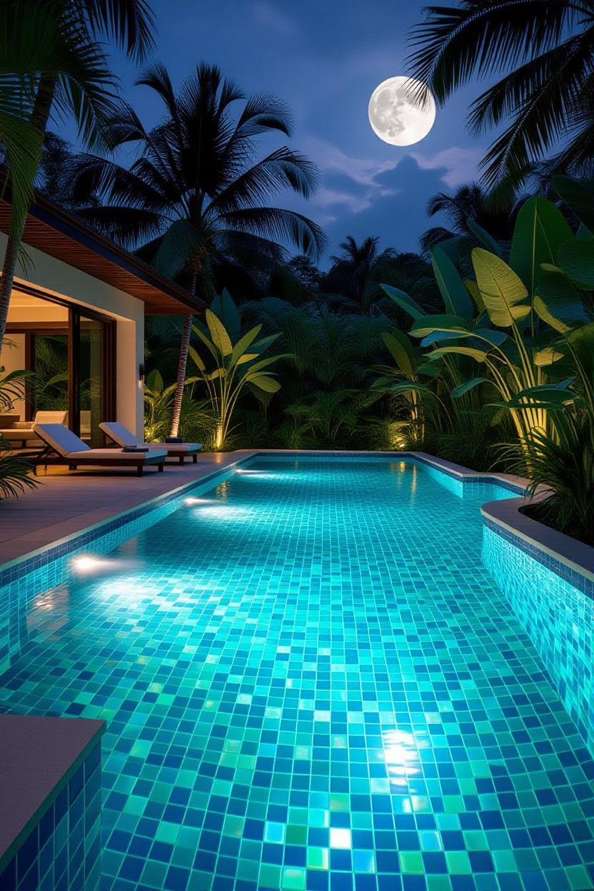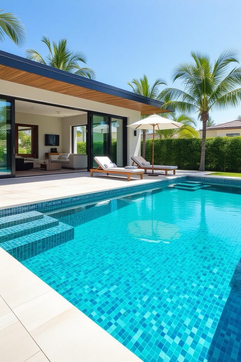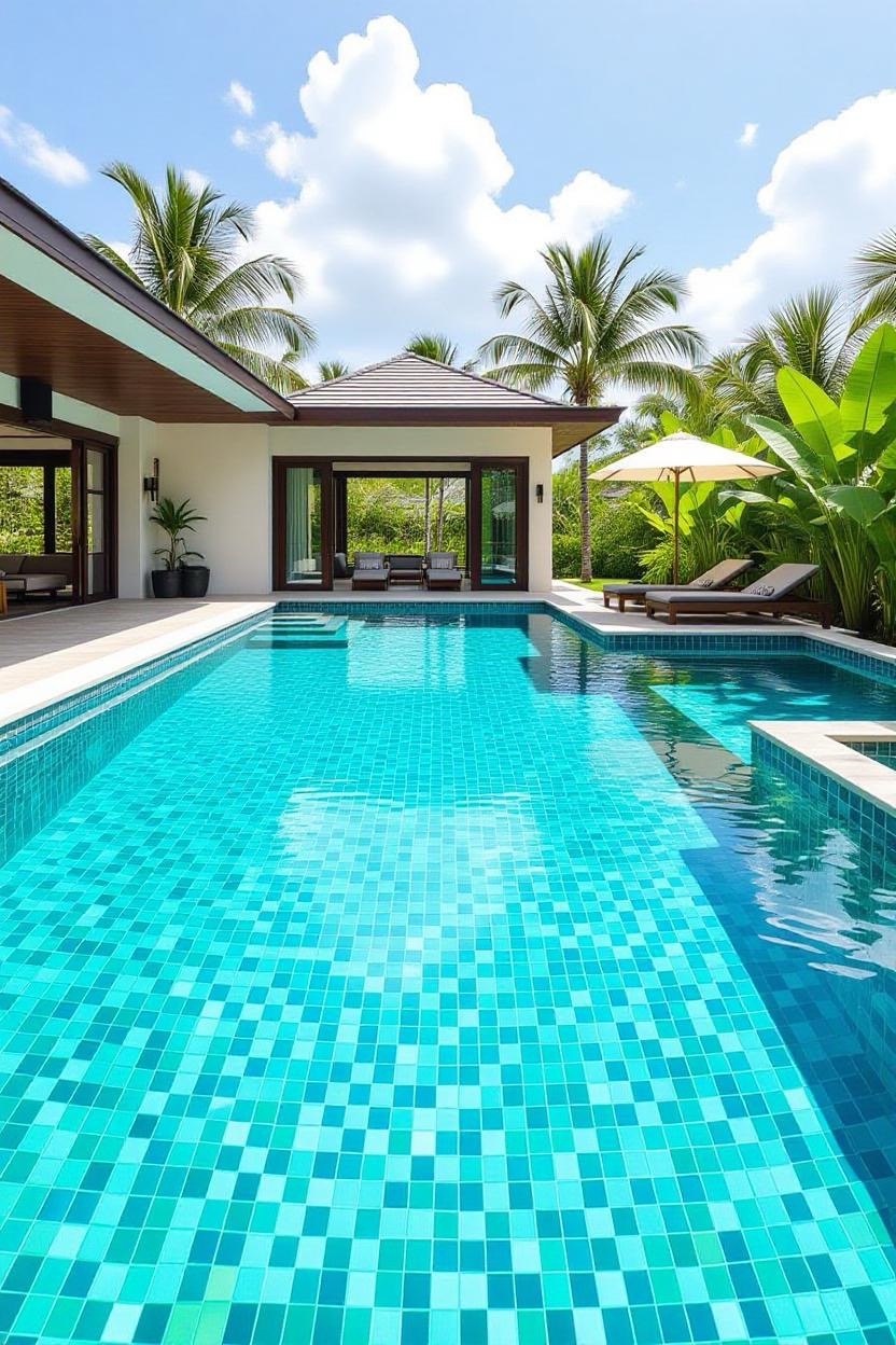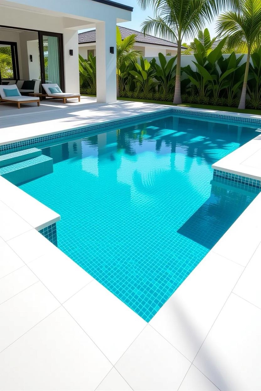 Turquoise tiles instantly evoke a coastal atmosphere, making your backyard feel like a Caribbean getaway. Pair them with palm trees and cabanas for the ultimate tropical retreat.