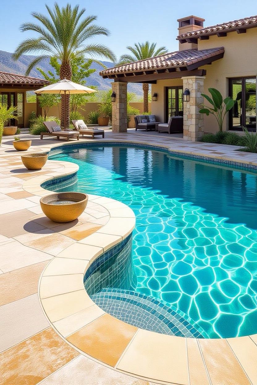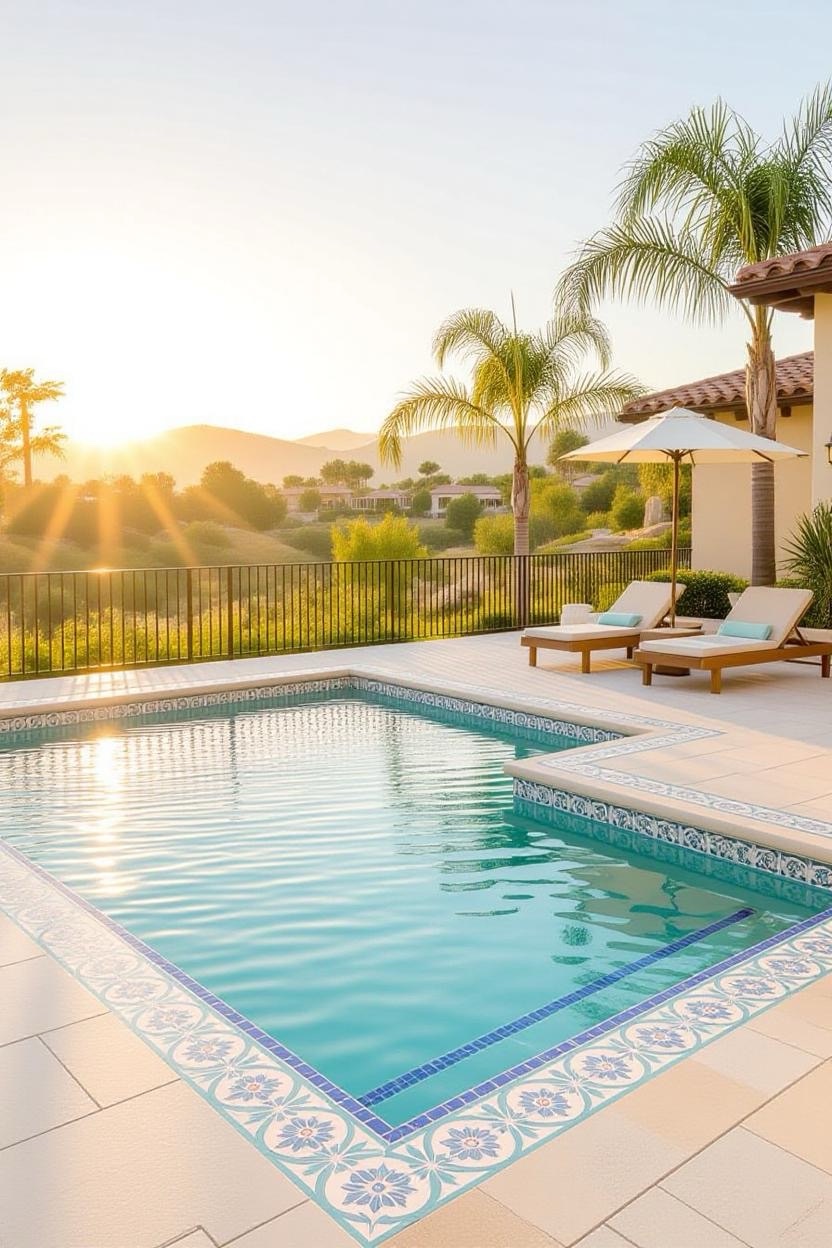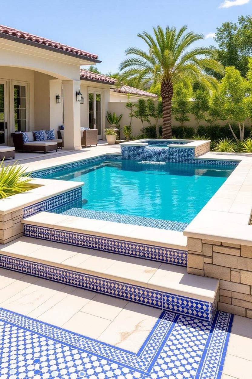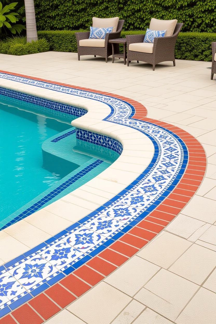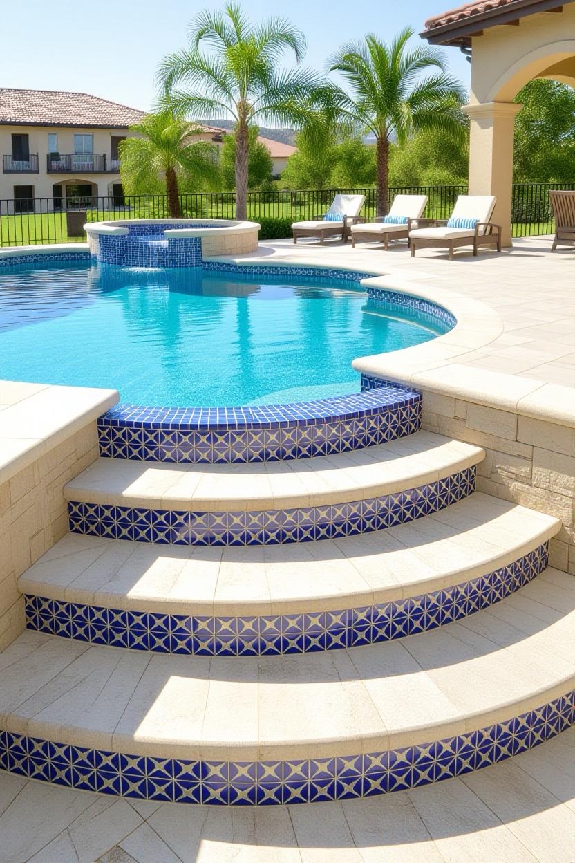 Adding a decorative tile border around steps, edges, or seating areas not only enhances safety but also provides stylish detailing to your pool design.