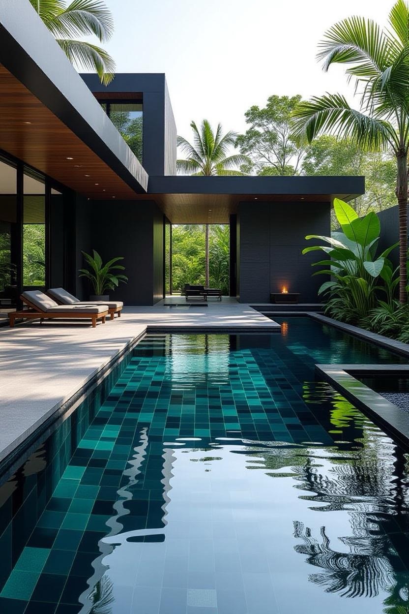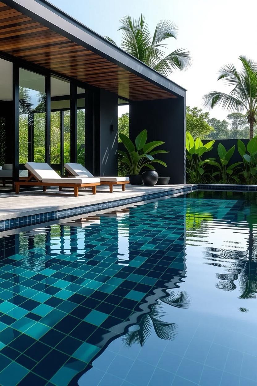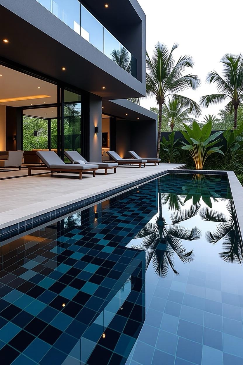 Black pool tiles create a striking, mirror-like effect that adds drama and sophistication. They make the pool water look deeper and more reflective, ideal for contemporary designs.