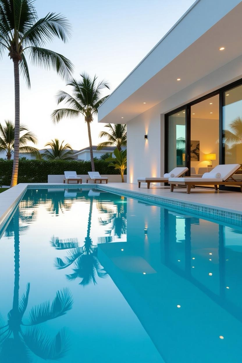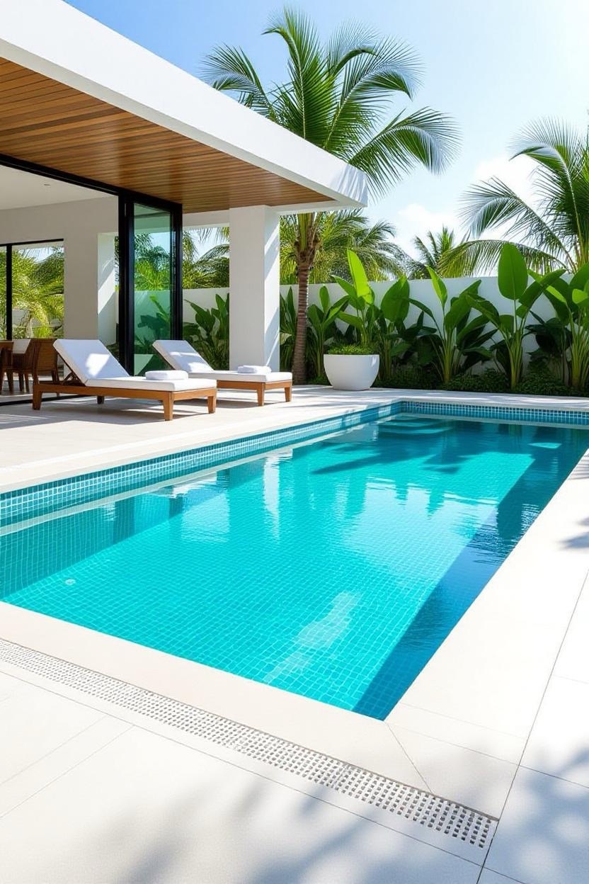 White pool tiles brighten up the water, creating a clean and refreshing ambiance. This minimalist option pairs perfectly with modern outdoor decor and sleek architecture.