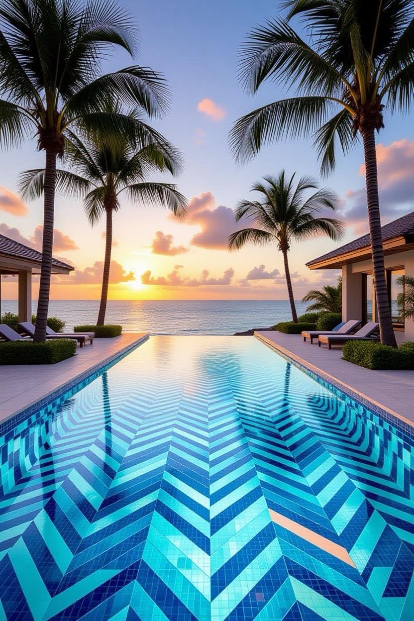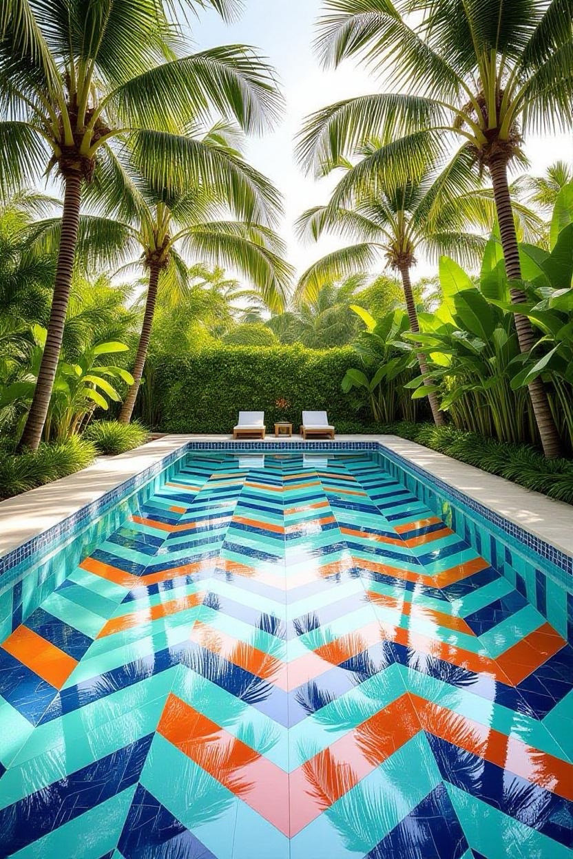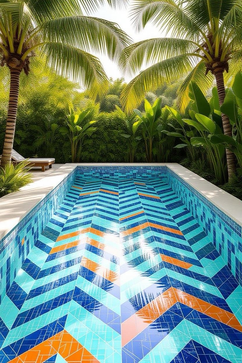 Experiment with different tile shapes, colors, and finishes for a creative, custom look. Chevron, herringbone, or patchwork tiling makes your pool truly one of a kind.