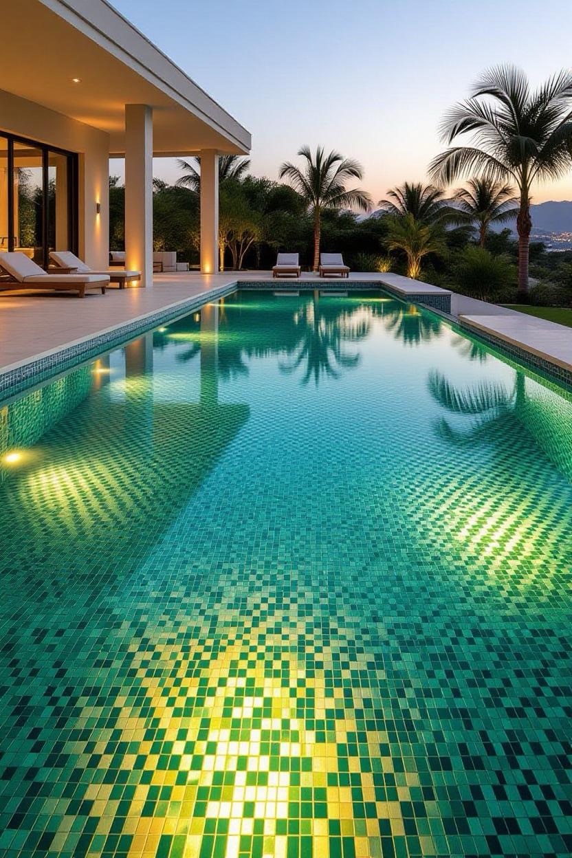 Iridescent pool tiles shimmer in different hues depending on the light, adding a touch of magic and glamour to your swimming area.