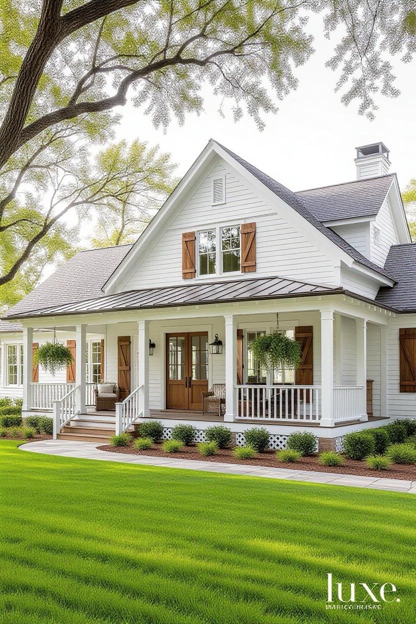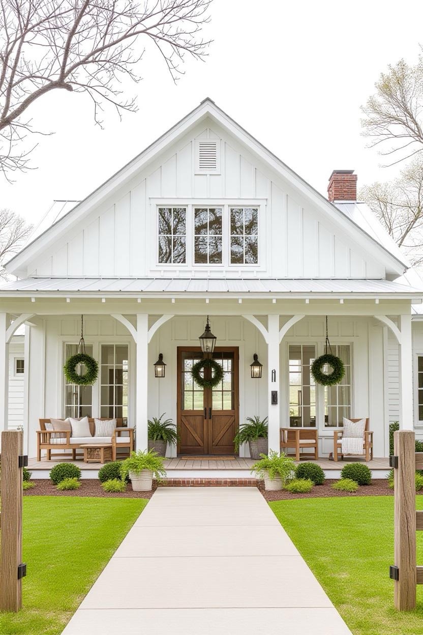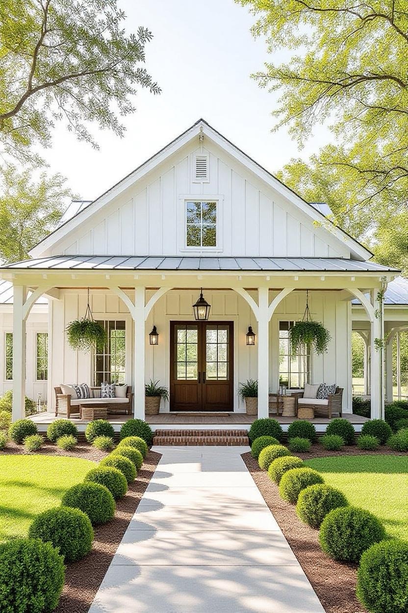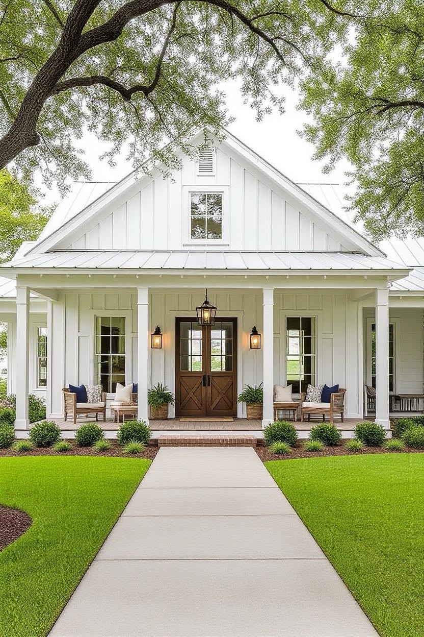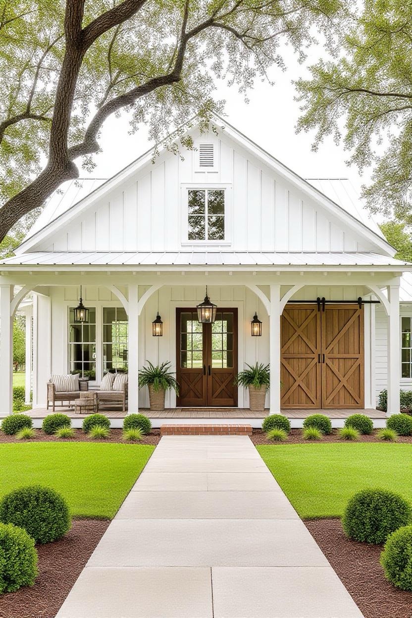 This ranch home combines the simplicity of rural architecture with chic farmhouse details, barn-style doors, shiplap walls, and vintage lighting. A spacious front porch welcomes guests, while the interior mixes white tones with warm wooden accents for a comfortable yet stylish atmosphere.