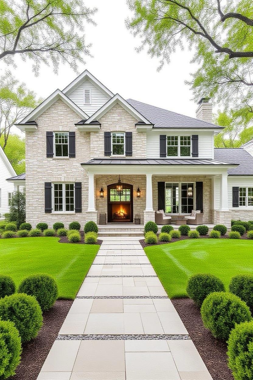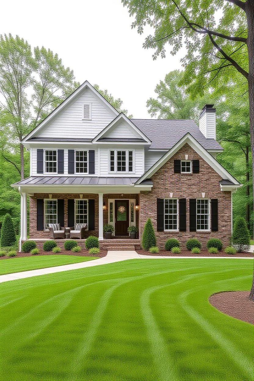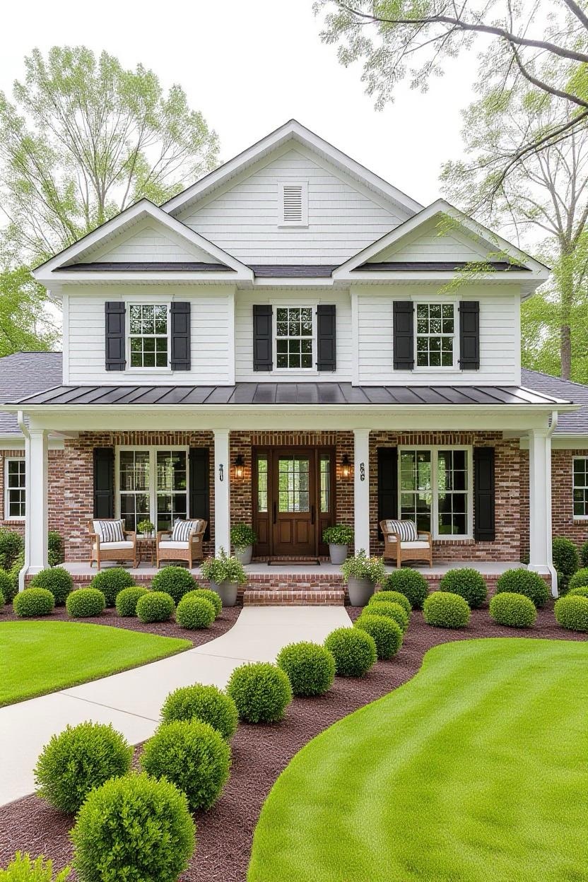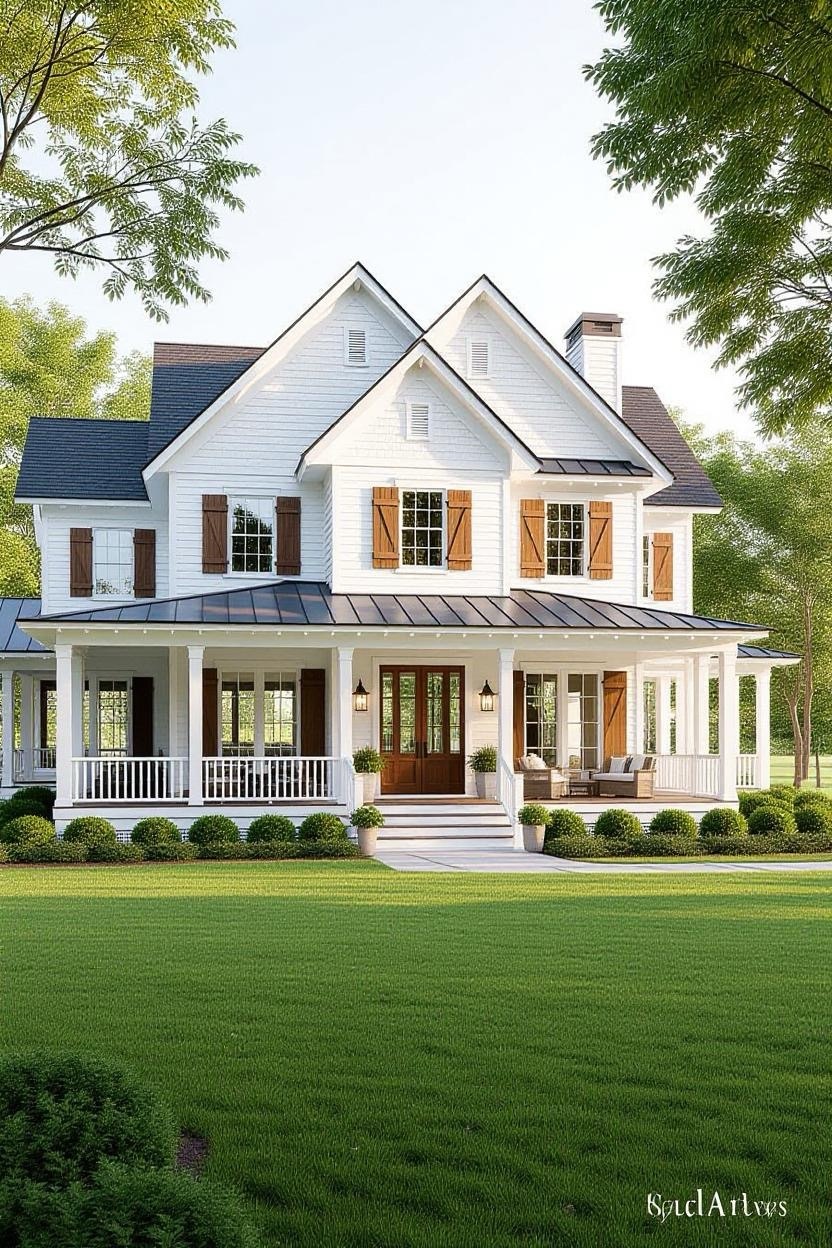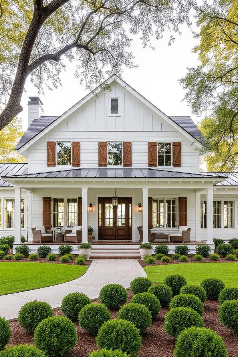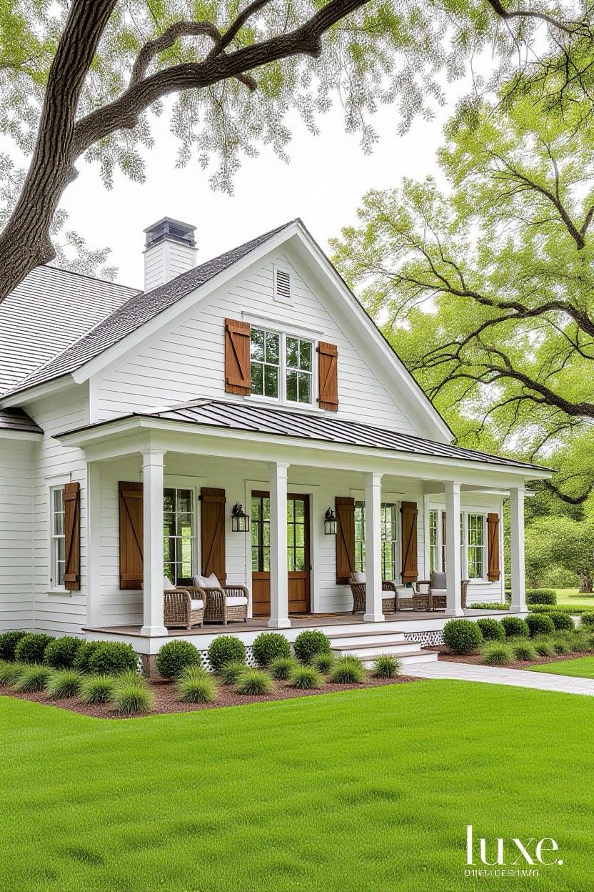 This ranch home combines the simplicity of rural architecture with chic farmhouse details, barn-style doors, shiplap walls, and vintage lighting. A spacious front porch welcomes guests, while the interior mixes white tones with warm wooden accents for a comfortable yet stylish atmosphere.