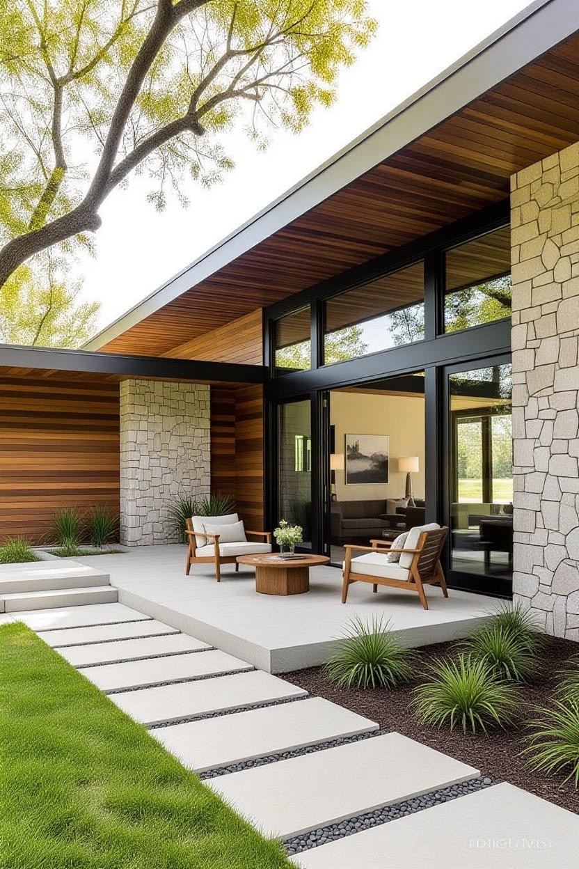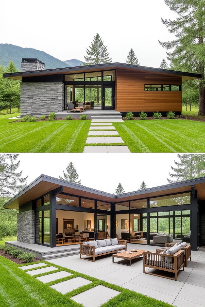 A sleek take on the classic ranch, this design blends mid-century modern inspiration with updated finishes. Think clean lines, dark window frames, and a mix of stone and wood cladding. The open-concept floor plan maximizes space and light, making the home feel airy yet grounded in comfort.