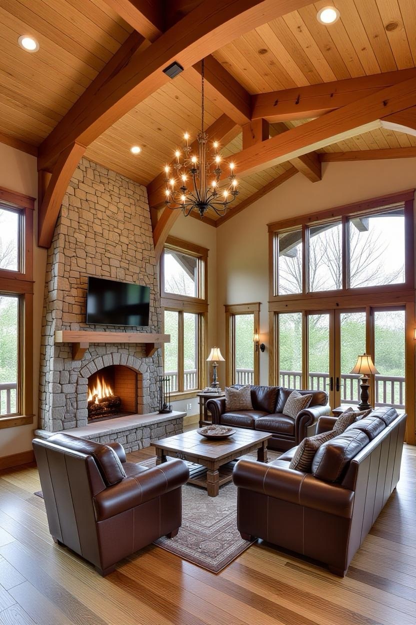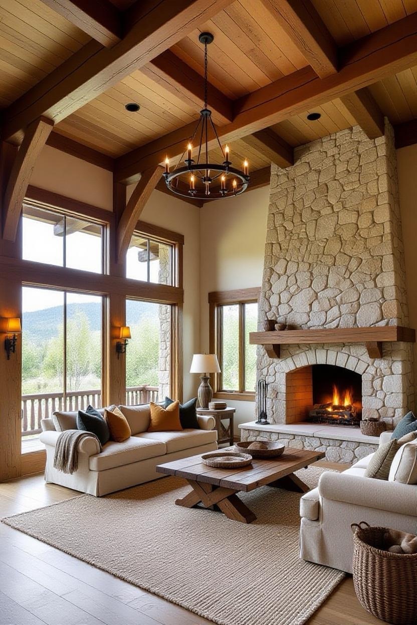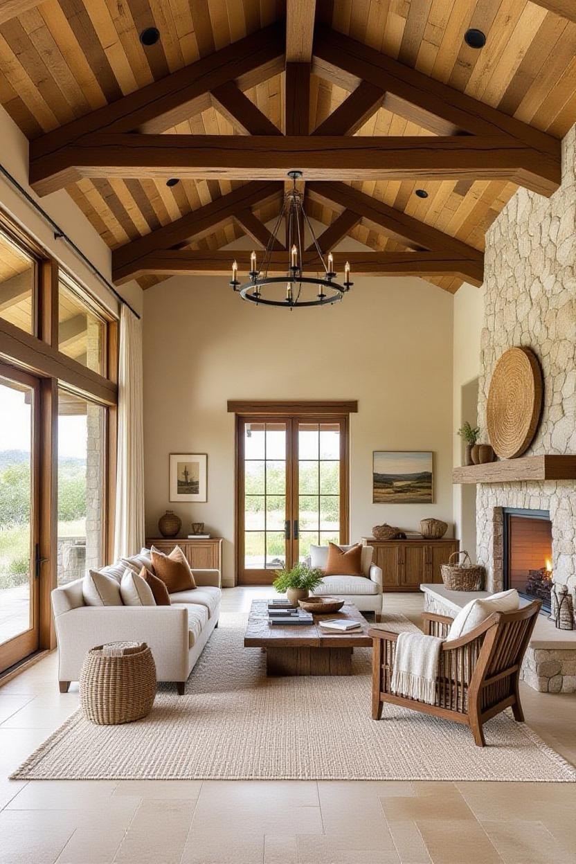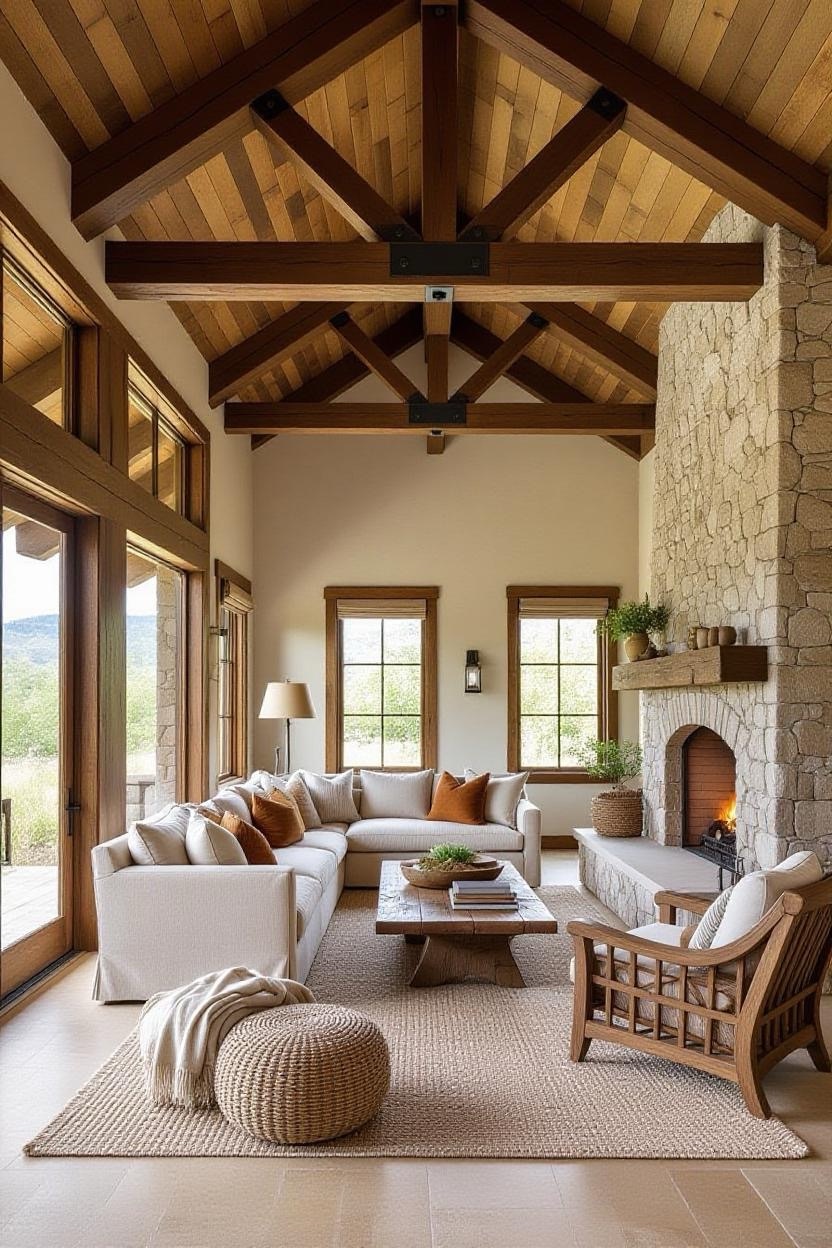 Set against a scenic backdrop, this ranch design embraces natural stone exteriors and heavy wooden beams. The earthy tones complement its surroundings, while the interior balances exposed wood with soft textiles. It’s a cozy countryside escape that feels both rugged and refined.
