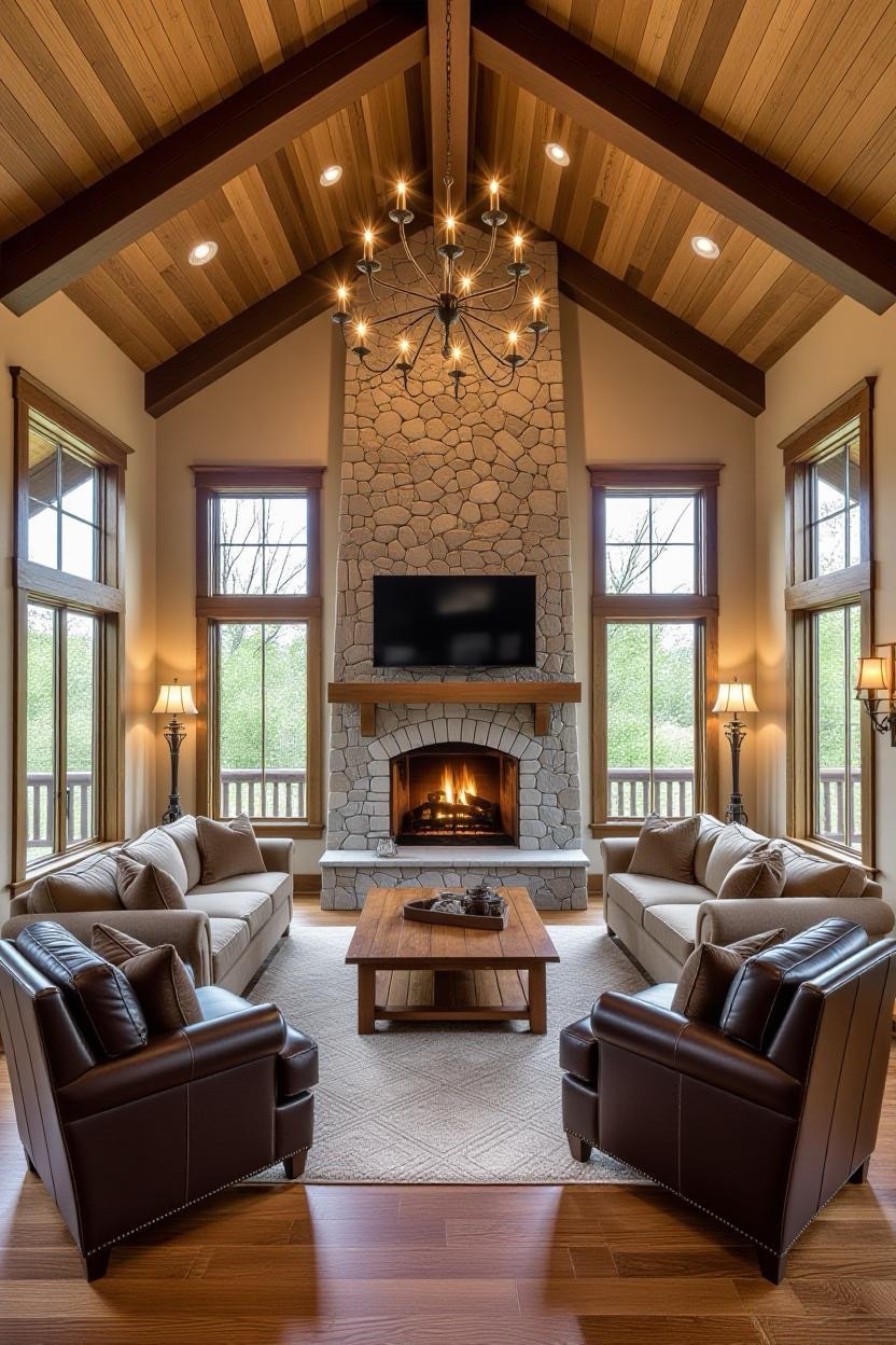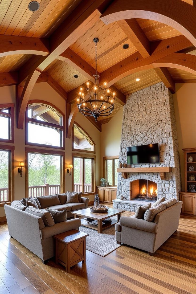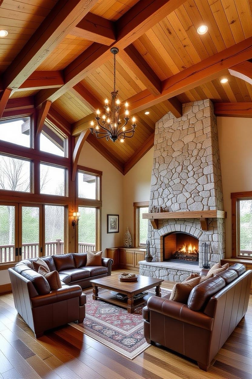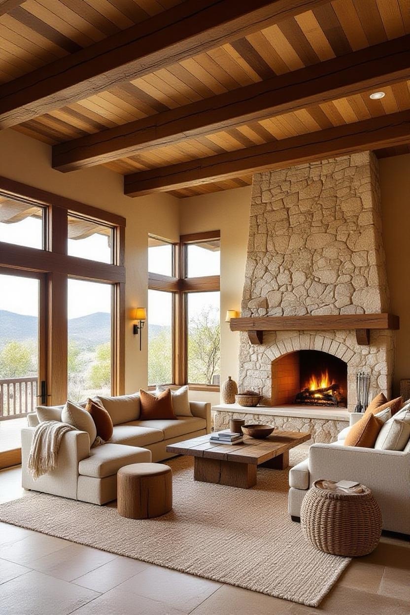Set against a scenic backdrop, this ranch design embraces natural stone exteriors and heavy wooden beams. The earthy tones complement its surroundings, while the interior balances exposed wood with soft textiles. It’s a cozy countryside escape that feels both rugged and refined.