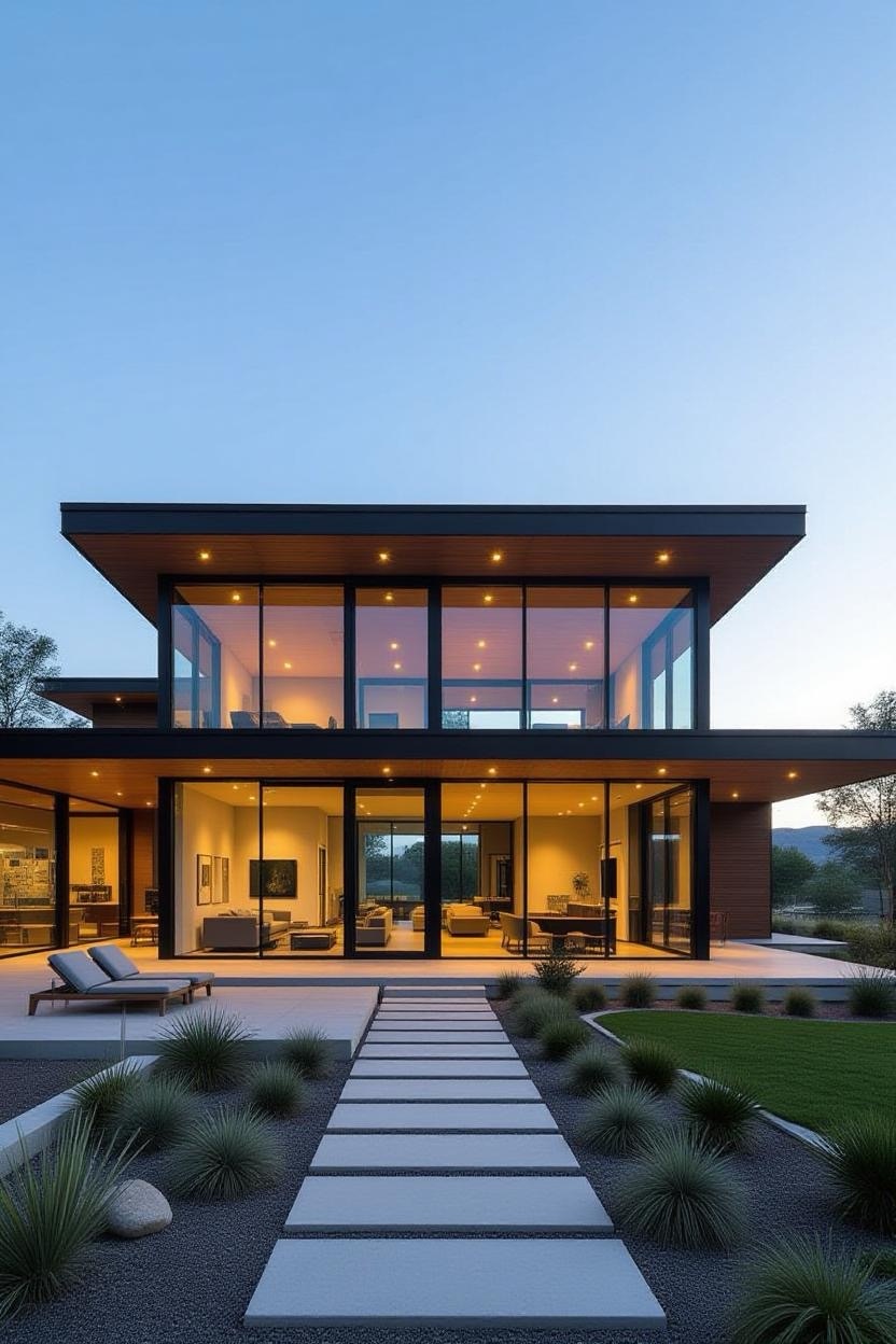 Perfect for modern living, this home features floor-to-ceiling glass walls that merge the indoors with the outdoors. The flat roofline and open layout give it a sleek, minimalist aesthetic. Ideal for warm climates, it’s a design that celebrates natural light and open-air serenity.