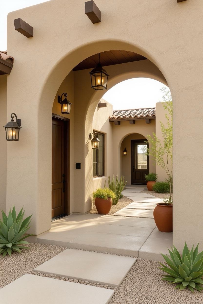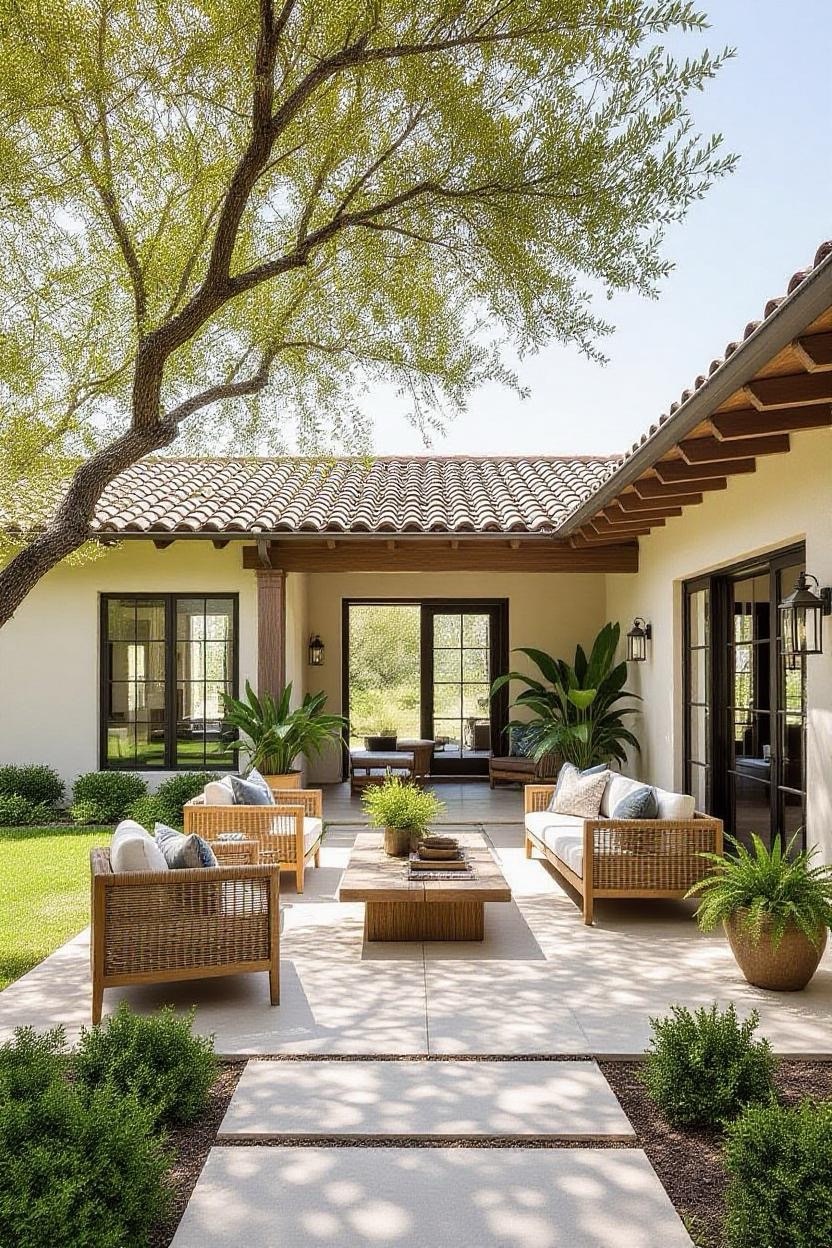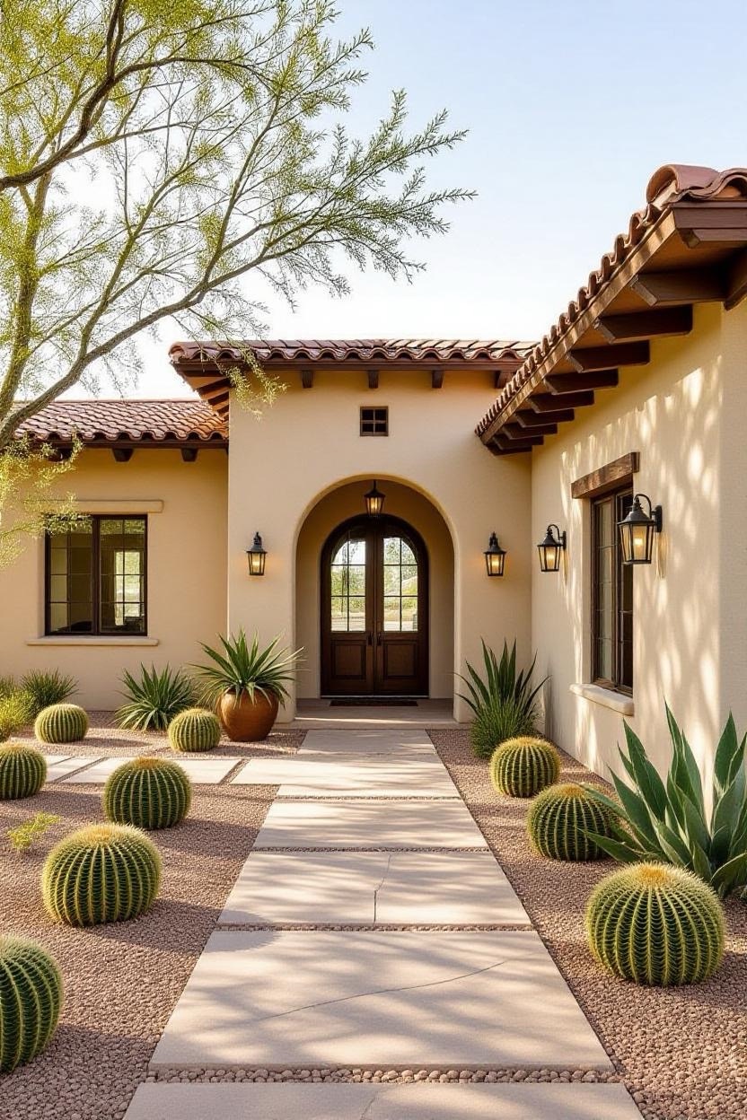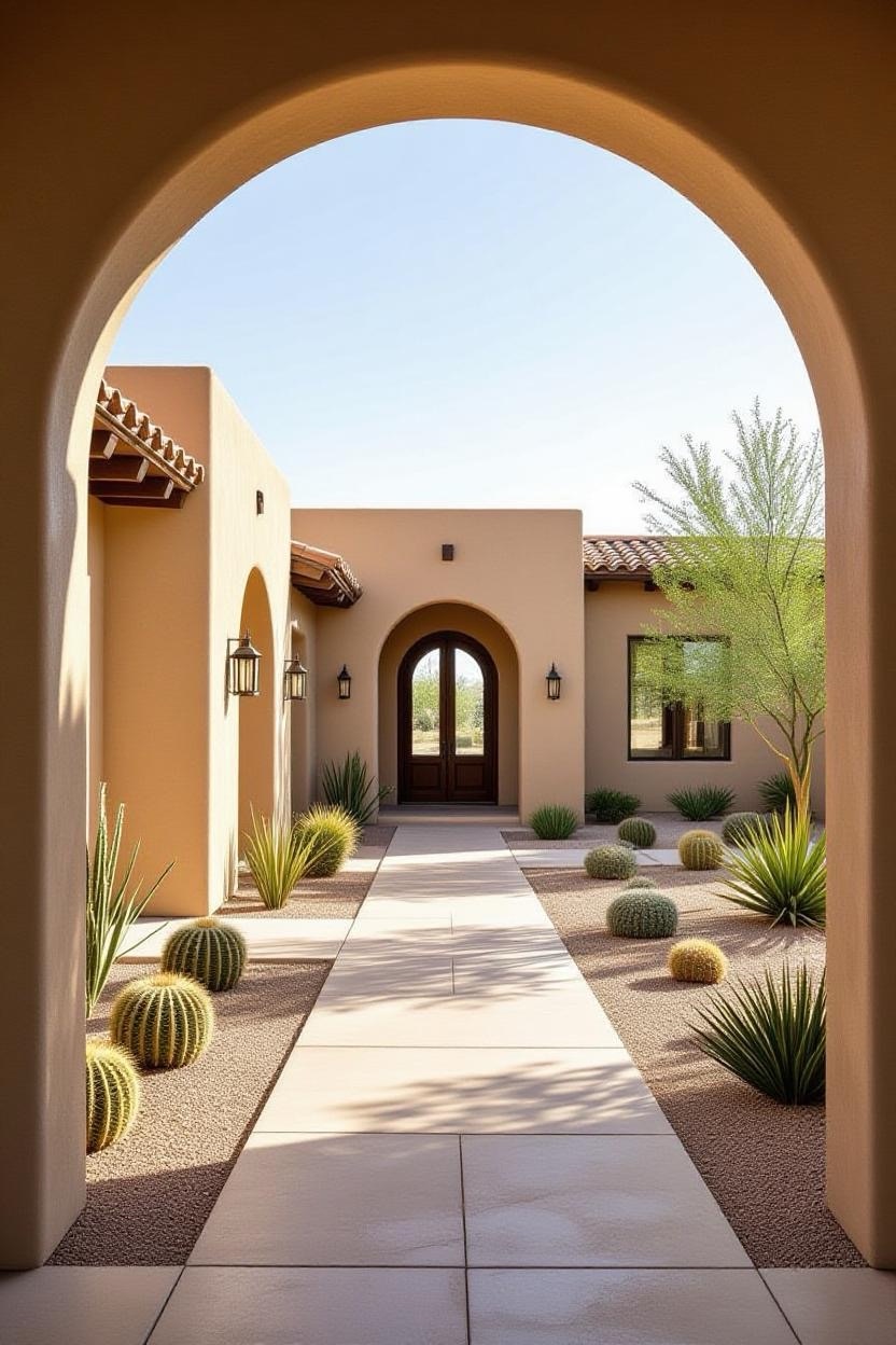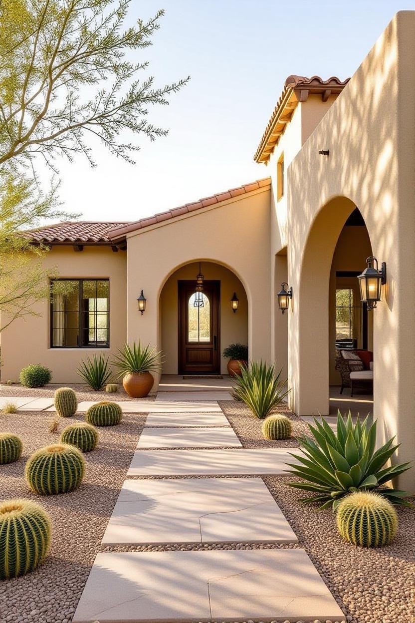 With stucco walls, terracotta tiles, and desert-hued landscaping, this ranch design draws inspiration from Southwestern aesthetics. The warm palette and arched doorways create a calm and earthy feel, blending seamlessly into desert or dry-climate settings.