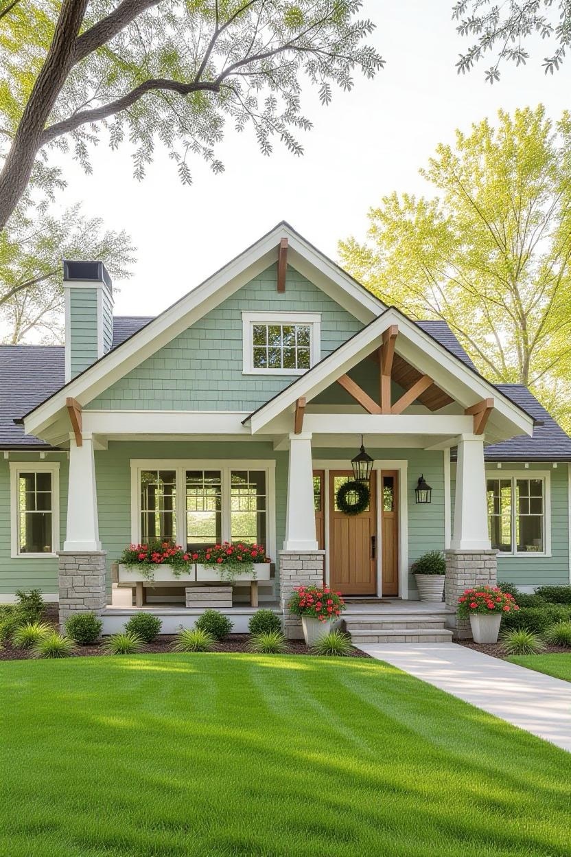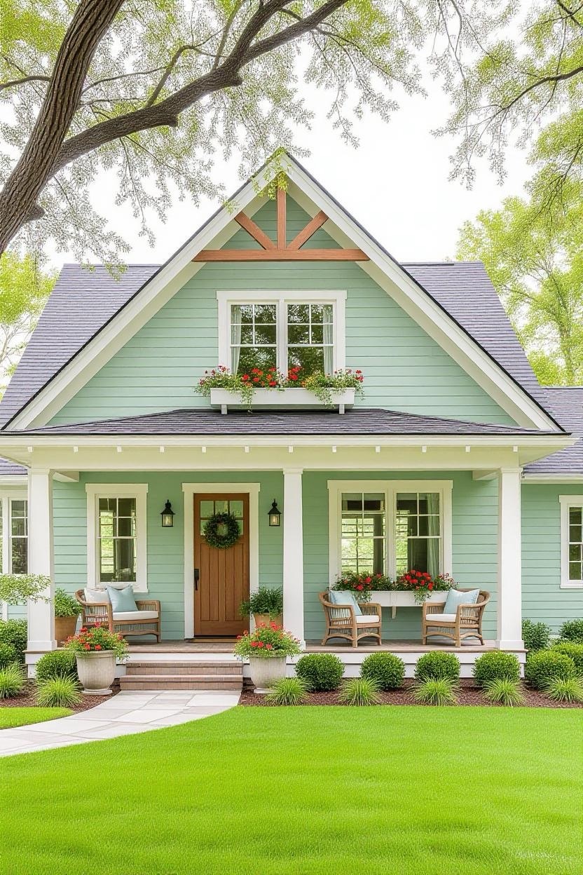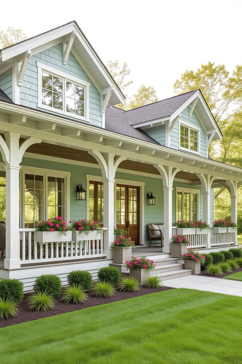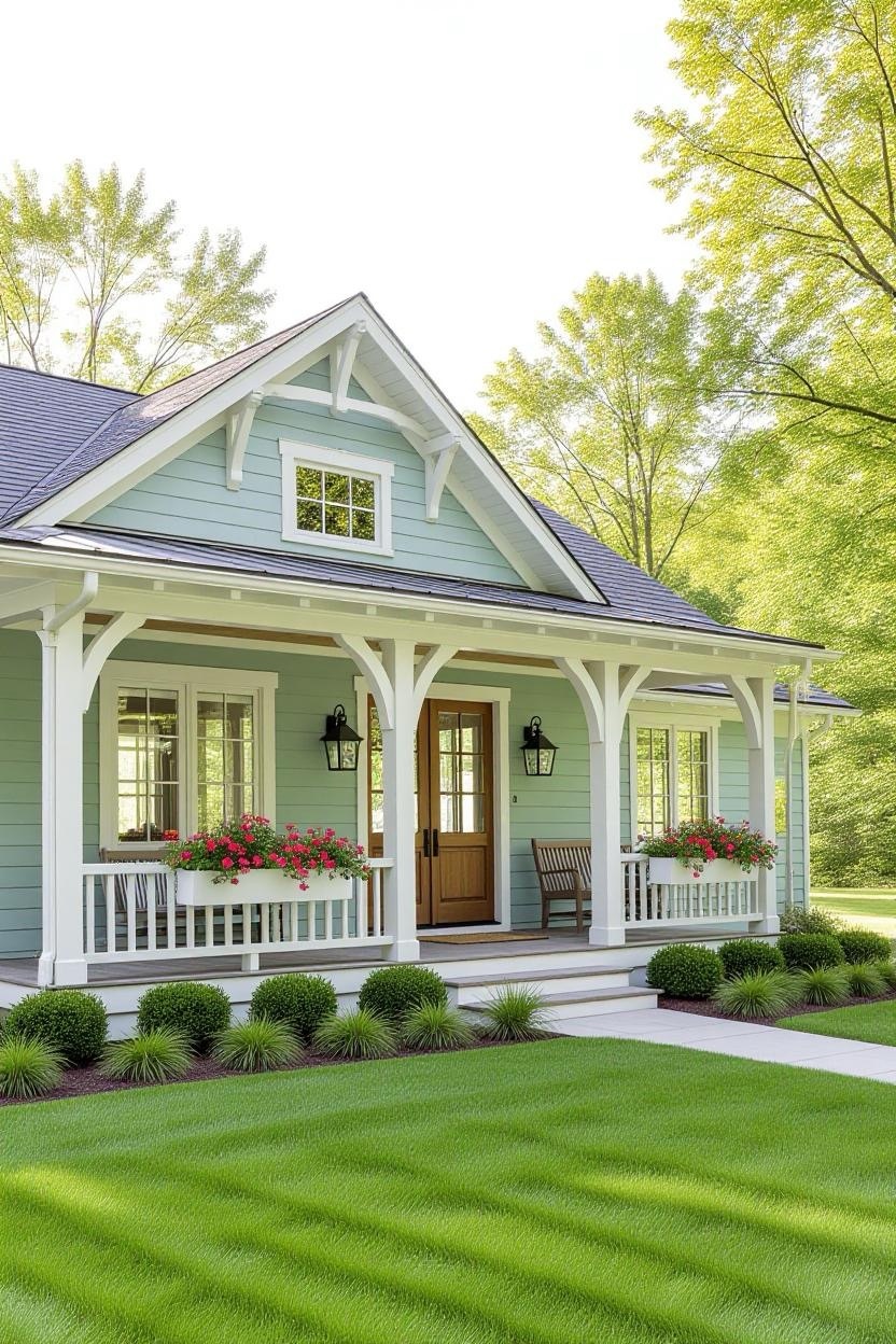 For smaller spaces, this ranch takes on a cottage-like charm. A gabled roof, flower boxes, and soft pastel exteriors give it storybook appeal. Inside, exposed beams and light wood finishes add warmth, making it an ideal downsized or starter home.