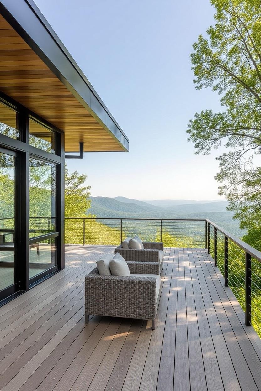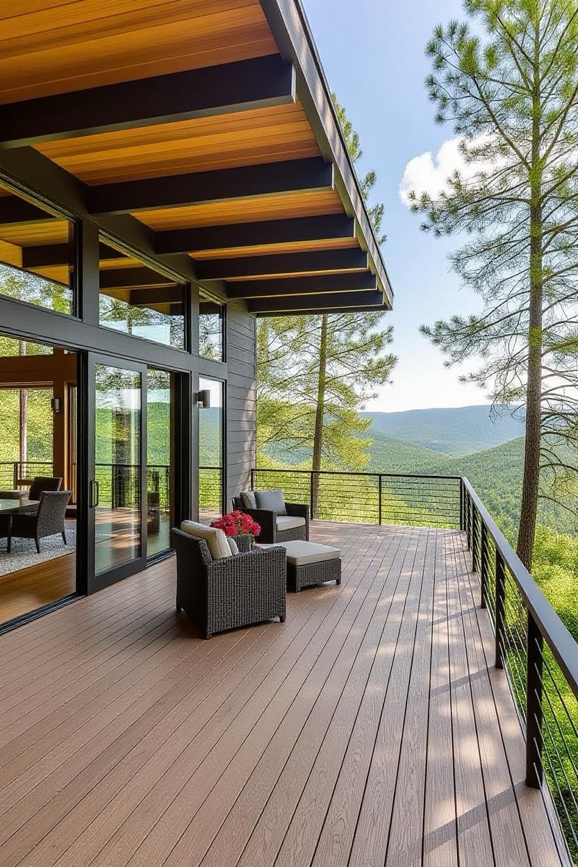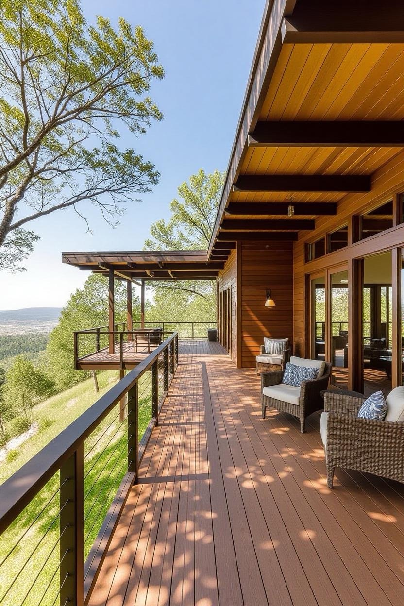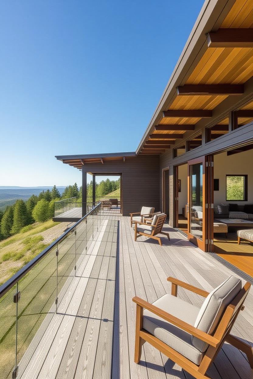 Built on a gentle slope, this design takes advantage of natural elevation to create panoramic views. Expansive decks and glass railings enhance the connection to nature, while the main living area opens onto the outdoors, blurring the lines between inside and outside.