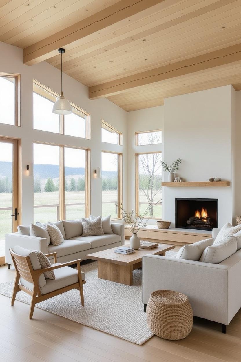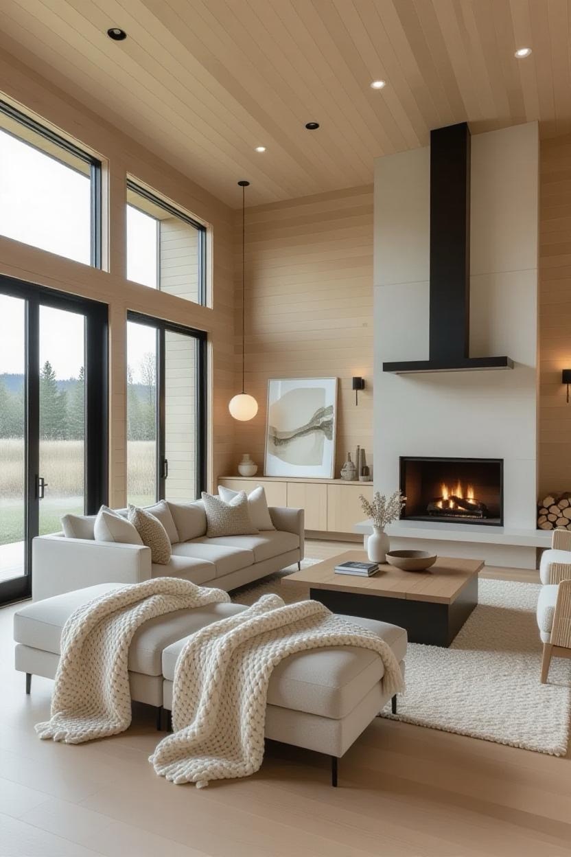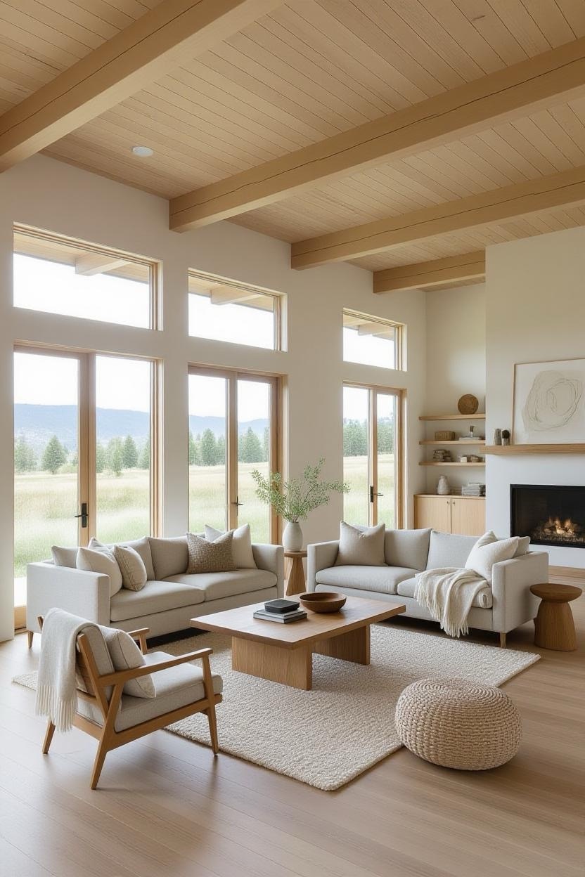 This minimalist ranch uses pale woods, neutral tones, and large windows to create a bright and calming space. The combination of sleek finishes and cozy textures reflects a Scandinavian approach to living, clean, simple, and focused on comfort.