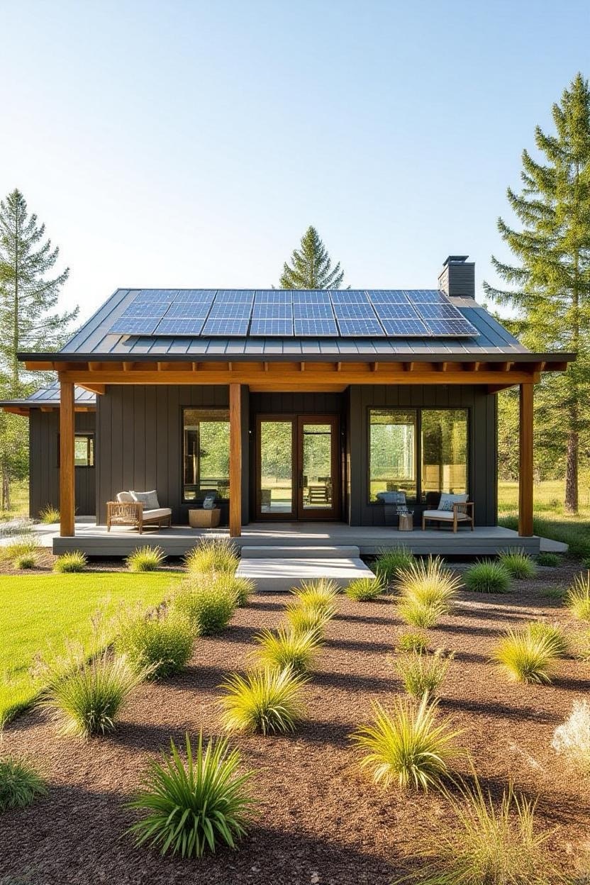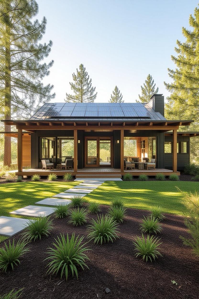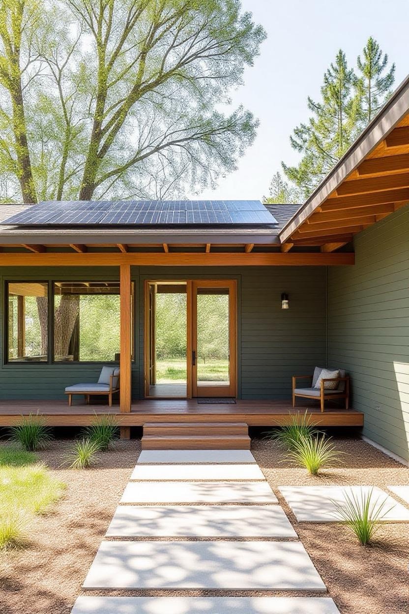 Sustainability meets style in this ranch featuring solar panels, recycled materials, and energy-efficient windows. The green design approach doesn’t compromise aesthetics, its natural finishes and modern lines make it a showpiece for environmentally conscious homeowners.