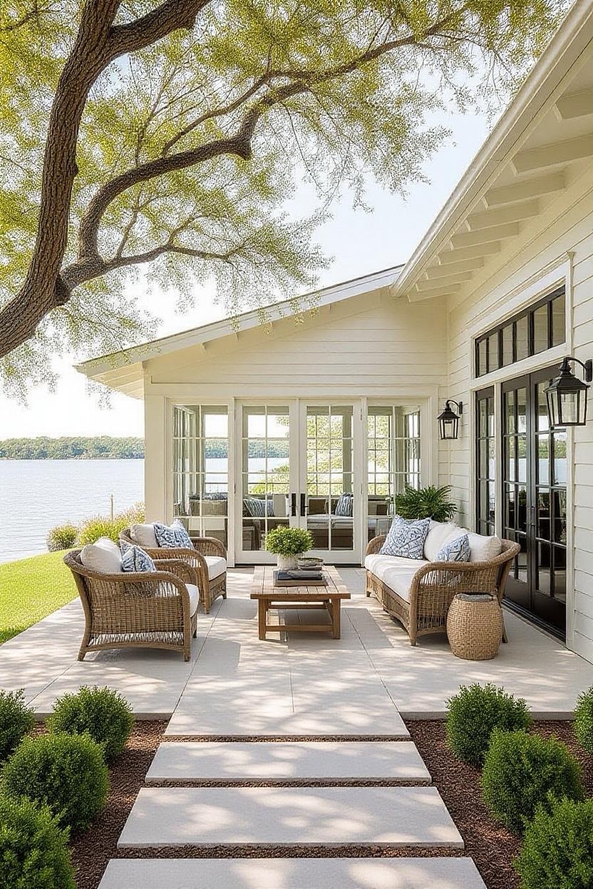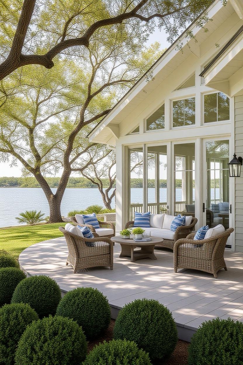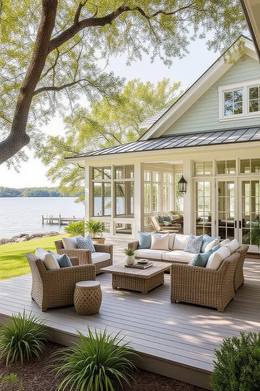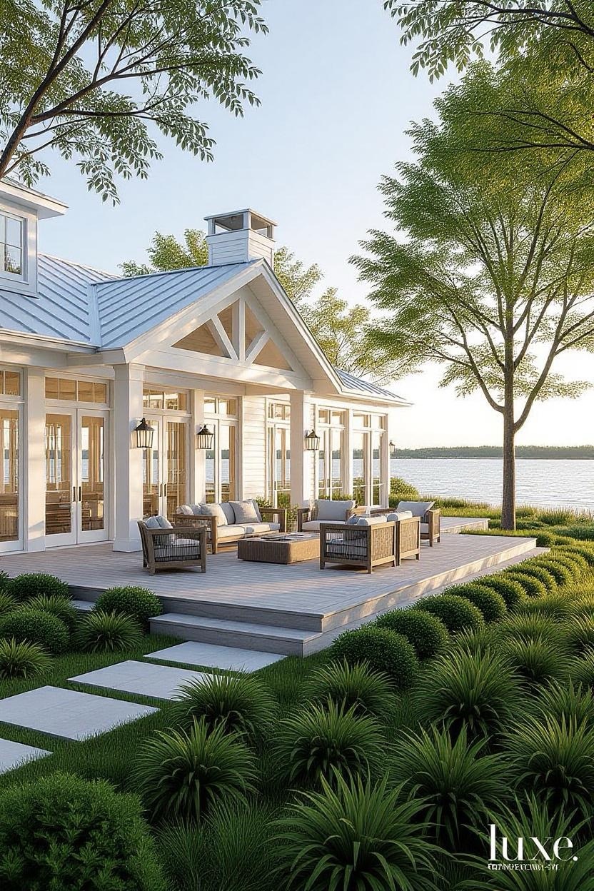This design captures serene waterside living. Wide patios, large windows, and screened porches create the perfect transition between indoor comfort and outdoor relaxation. The color palette, soft blues, whites, and sand tones, echoes the tranquil lakeside view.
