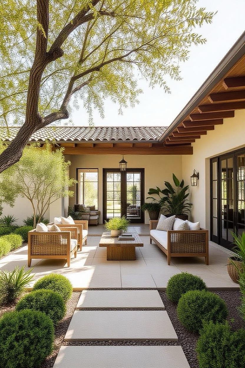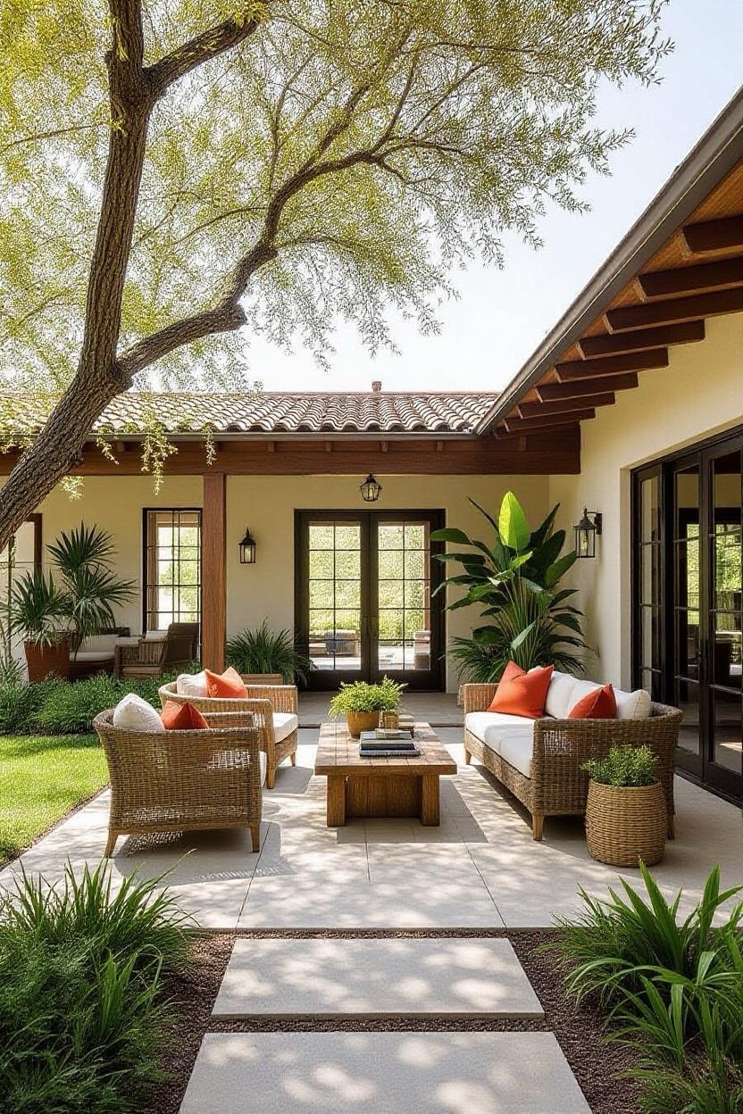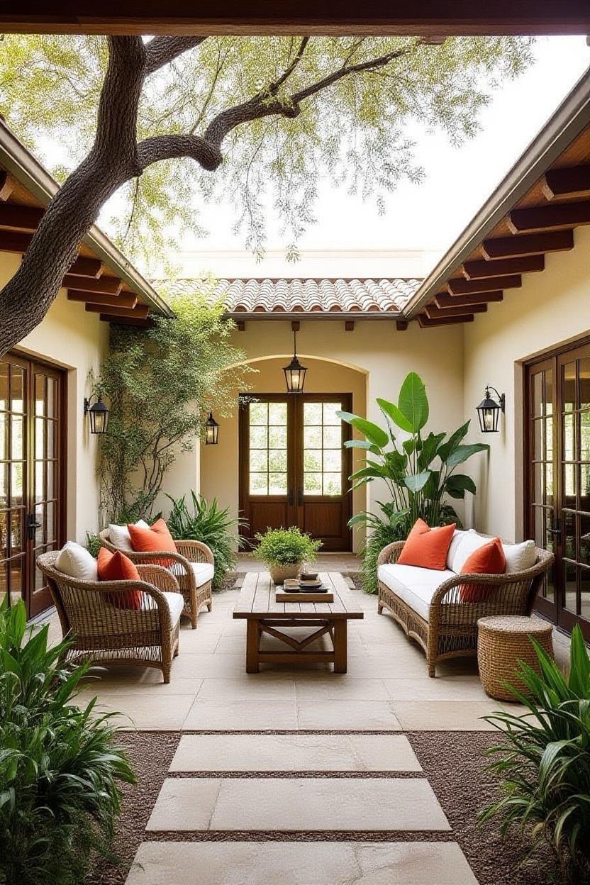 Centered around an open courtyard, this design brings the outdoors in. The courtyard serves as a private oasis with seating and greenery, while the rest of the home radiates around it. It’s a smart layout that maximizes light and privacy.