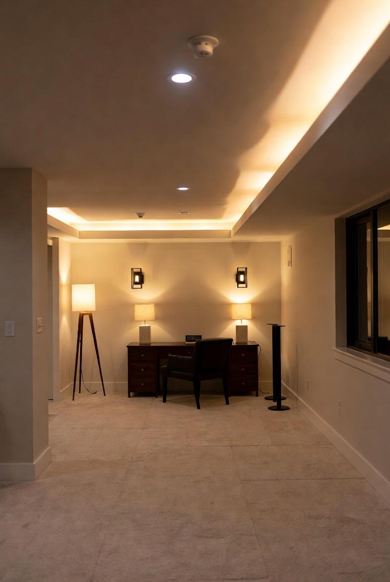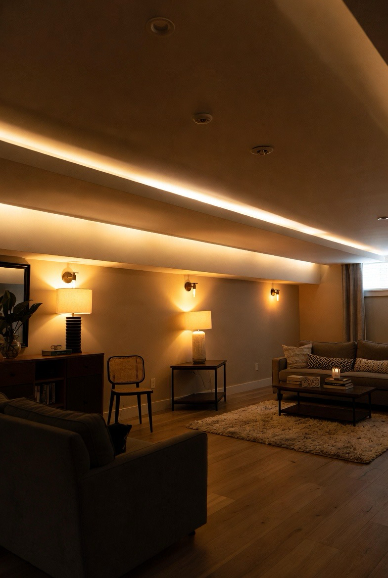 Lighting sets the mood in any basement, and soft, layered lighting instantly makes the space feel cozy. Recessed lights paired with table lamps, wall sconces, or floor lamps create depth and warmth. Avoid harsh overhead lighting and opt for warm-toned bulbs instead. This approach makes the basement feel more intimate and inviting, perfect for relaxing evenings or casual gatherings.