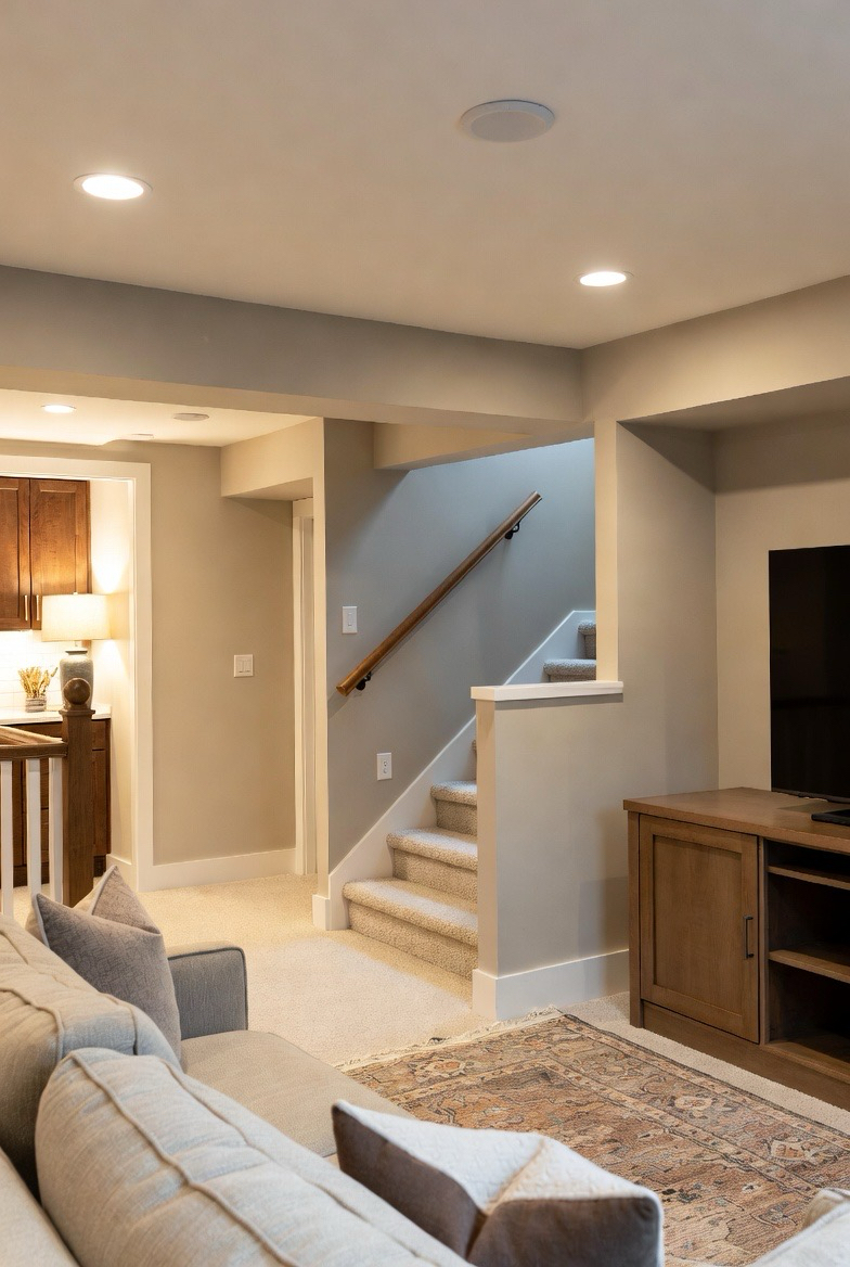 Warm neutrals like beige, taupe, soft gray, and creamy whites create a calming foundation for cozy basement design. These colors reflect light and help brighten lower-level spaces without feeling cold. When paired with wood accents and soft furnishings, warm neutrals make basements feel welcoming and well-balanced.