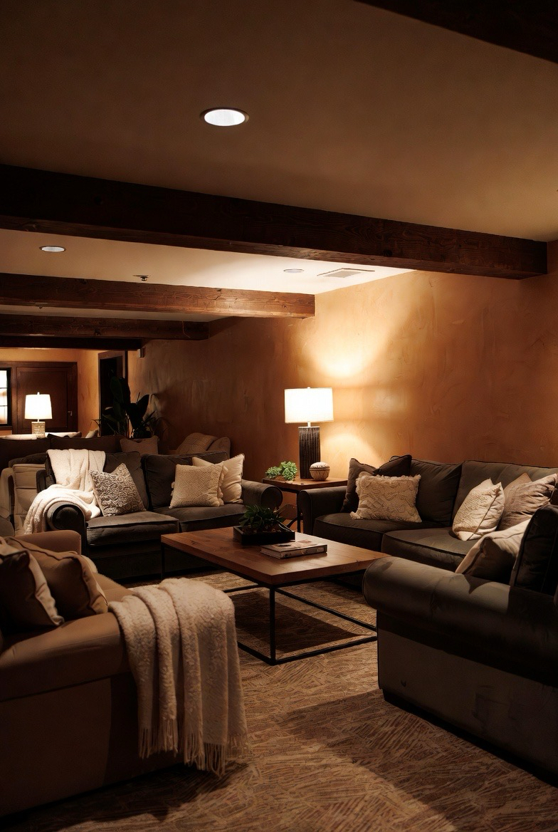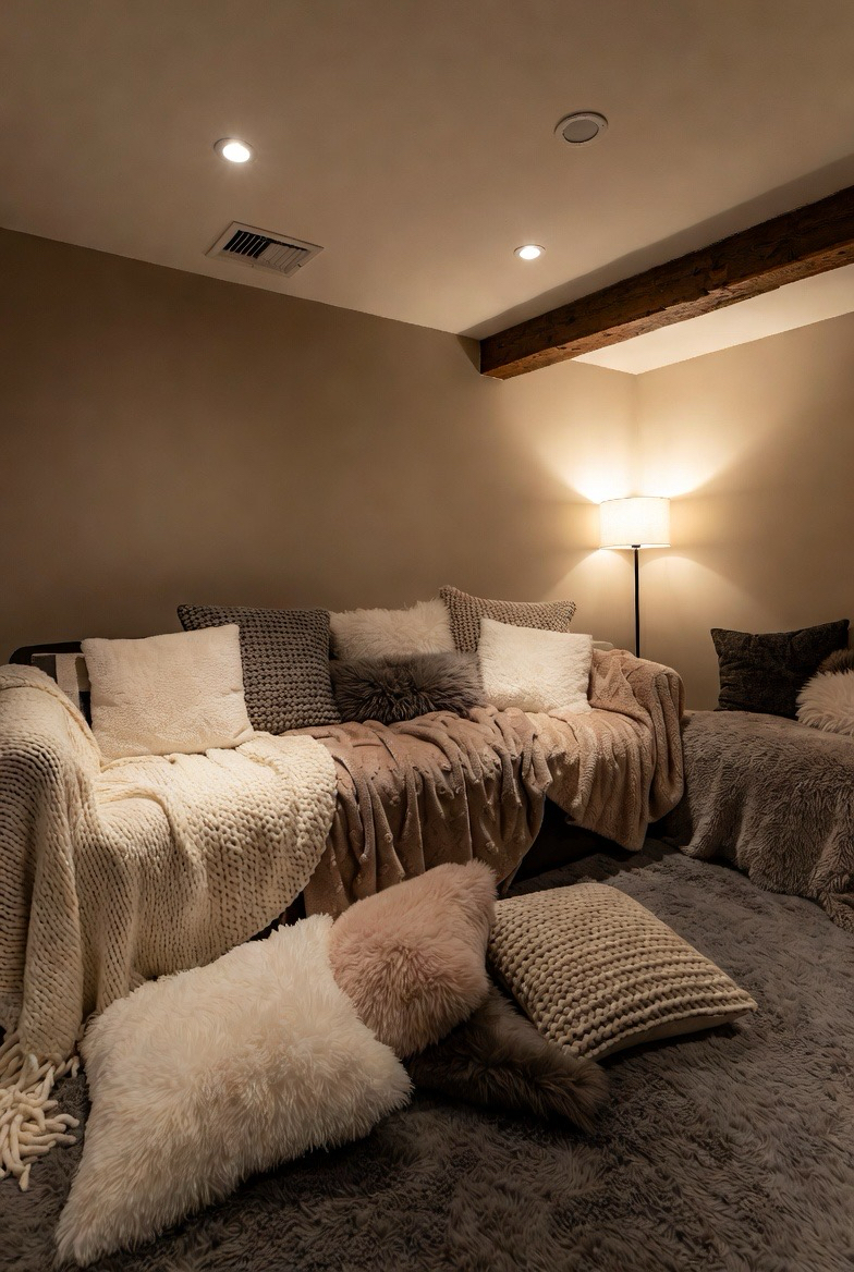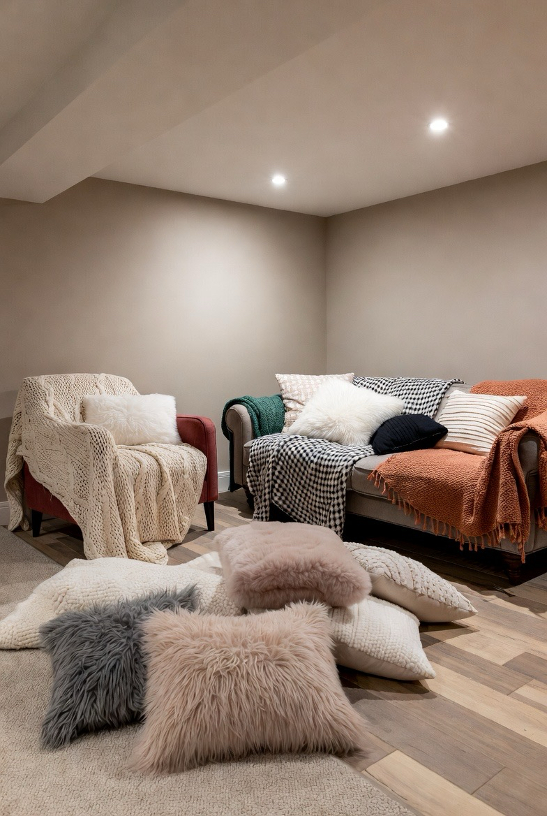 Throw blankets, cushions, and upholstered furniture create a layered, cozy look. Mixing textures like knits, faux fur, and woven fabrics adds depth and warmth. These small touches make the basement feel inviting and perfect for lounging.
