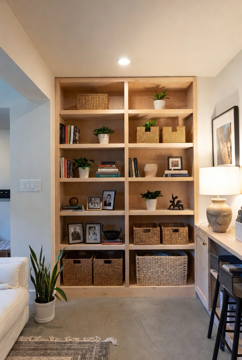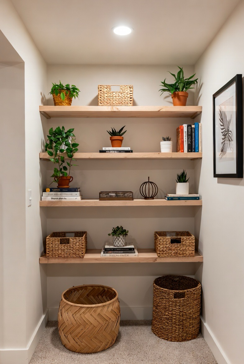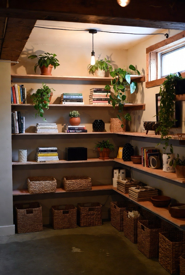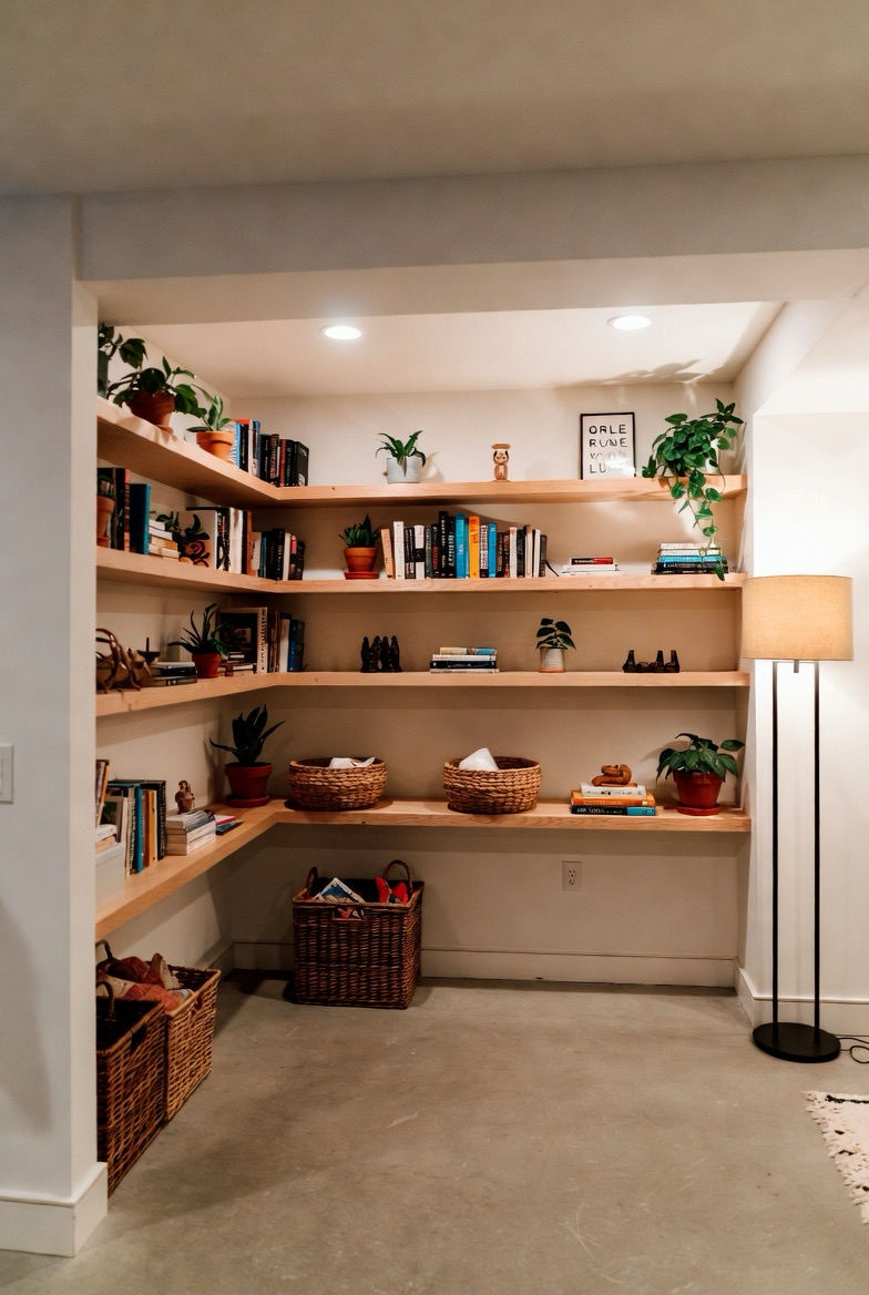 Built-in shelves add both function and warmth to basement walls. Styling them with books, plants, baskets, and personal decor helps the space feel lived-in. Wood shelving in particular adds texture and coziness while keeping the design organized and intentional.