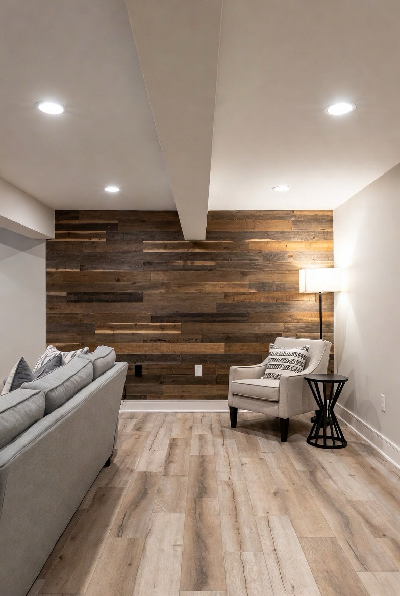 An accent wall can add personality and warmth to a basement. Consider wood paneling, textured wallpaper, or a warm paint color to create visual interest. Accent walls help define spaces and make the basement feel thoughtfully designed.