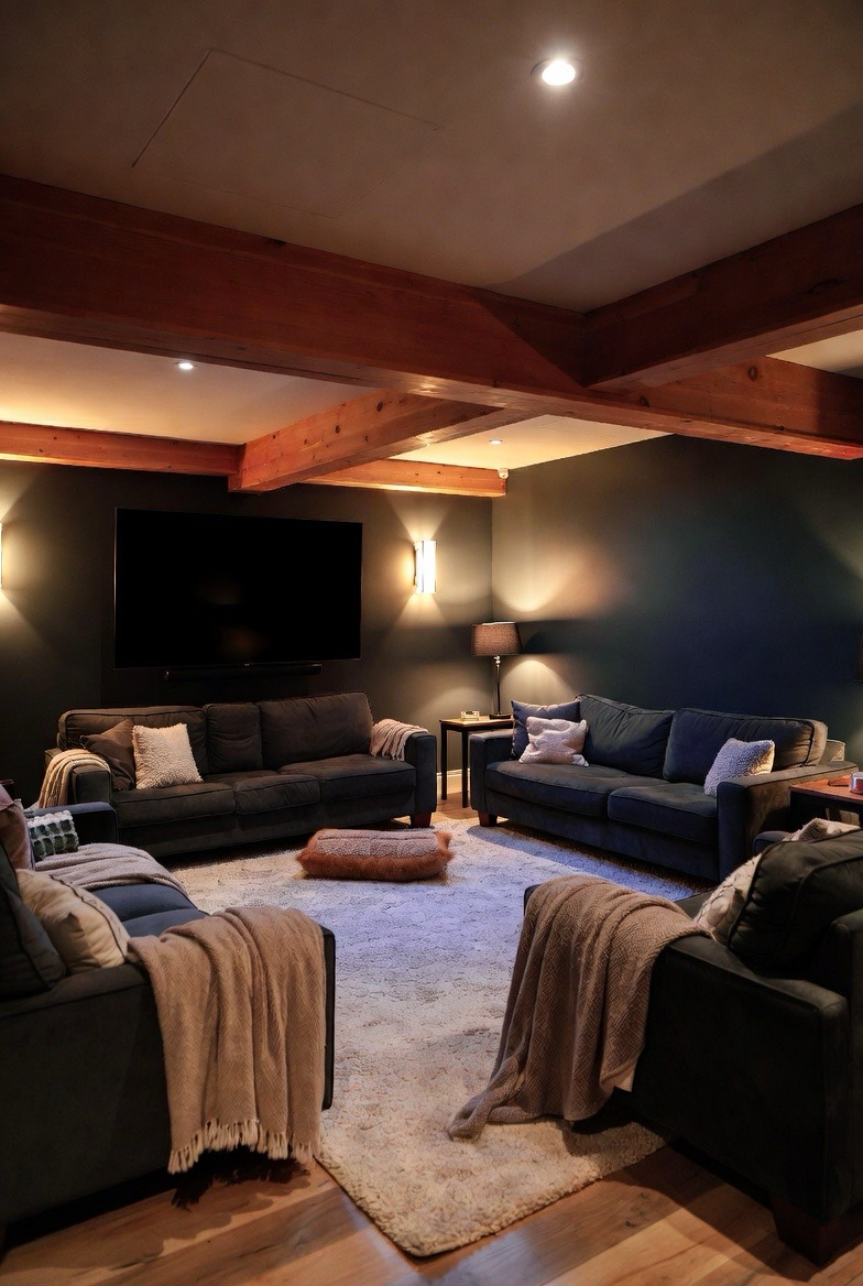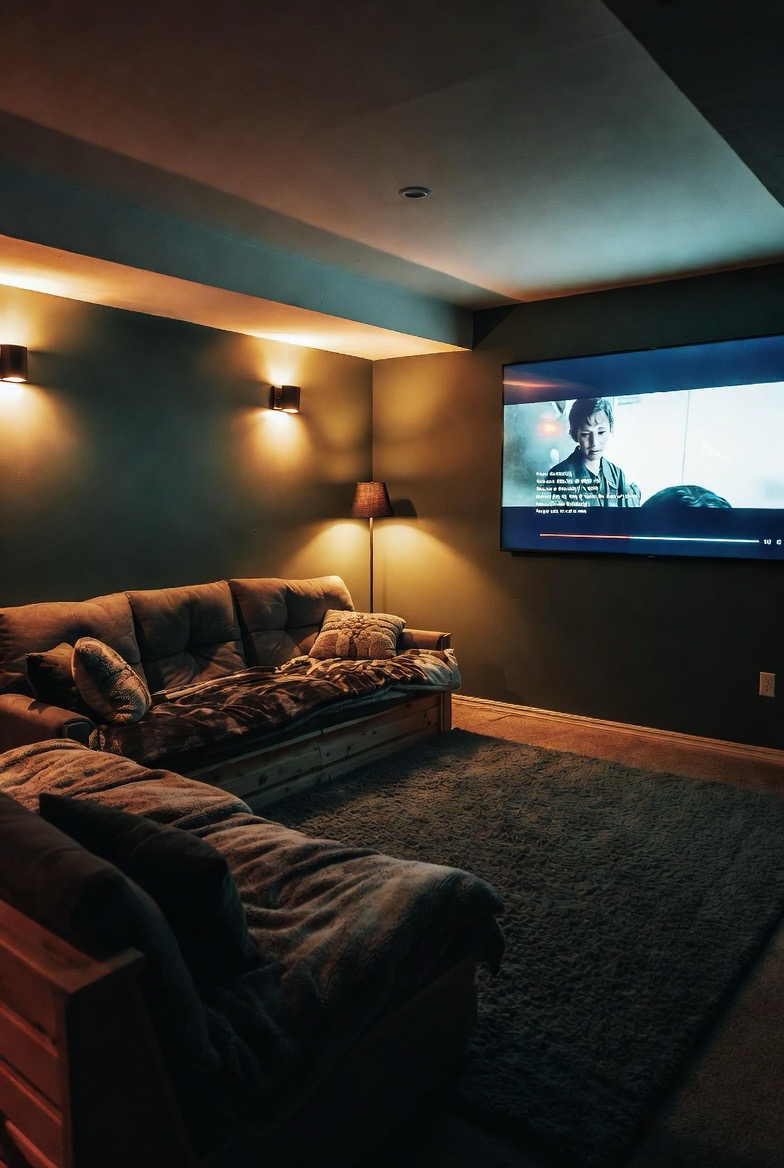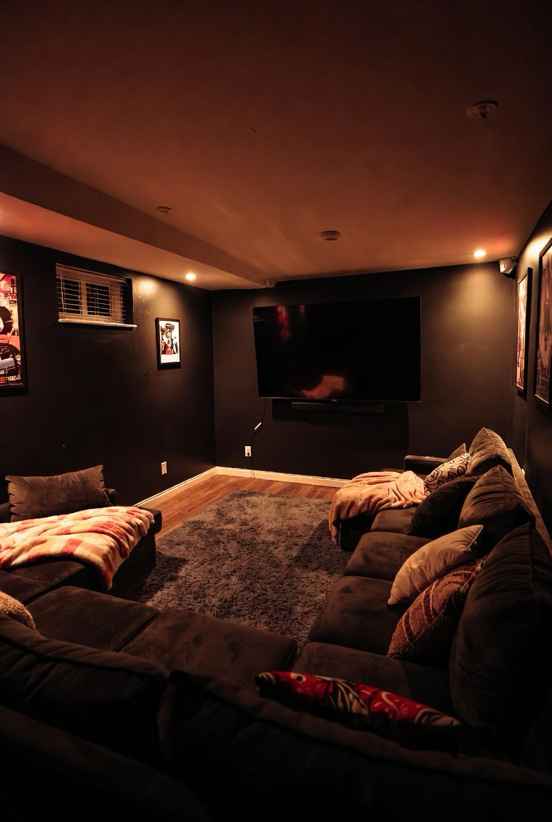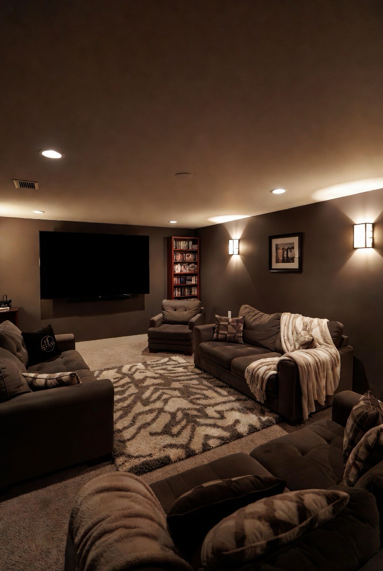 A basement home theater becomes extra inviting with plush seating, dim lighting, and soft rugs. Adding blankets and pillows enhances comfort while maintaining a stylish look. This setup turns movie nights into a cozy experience everyone will enjoy.