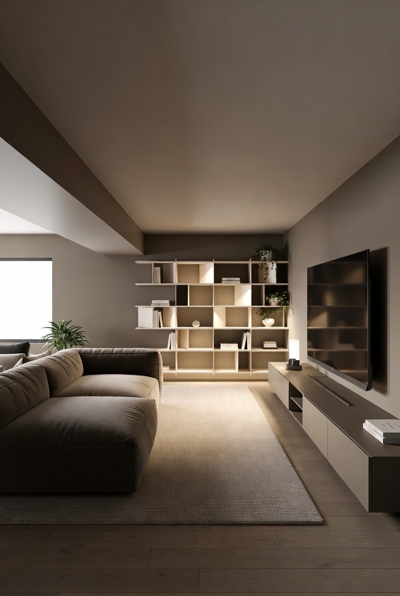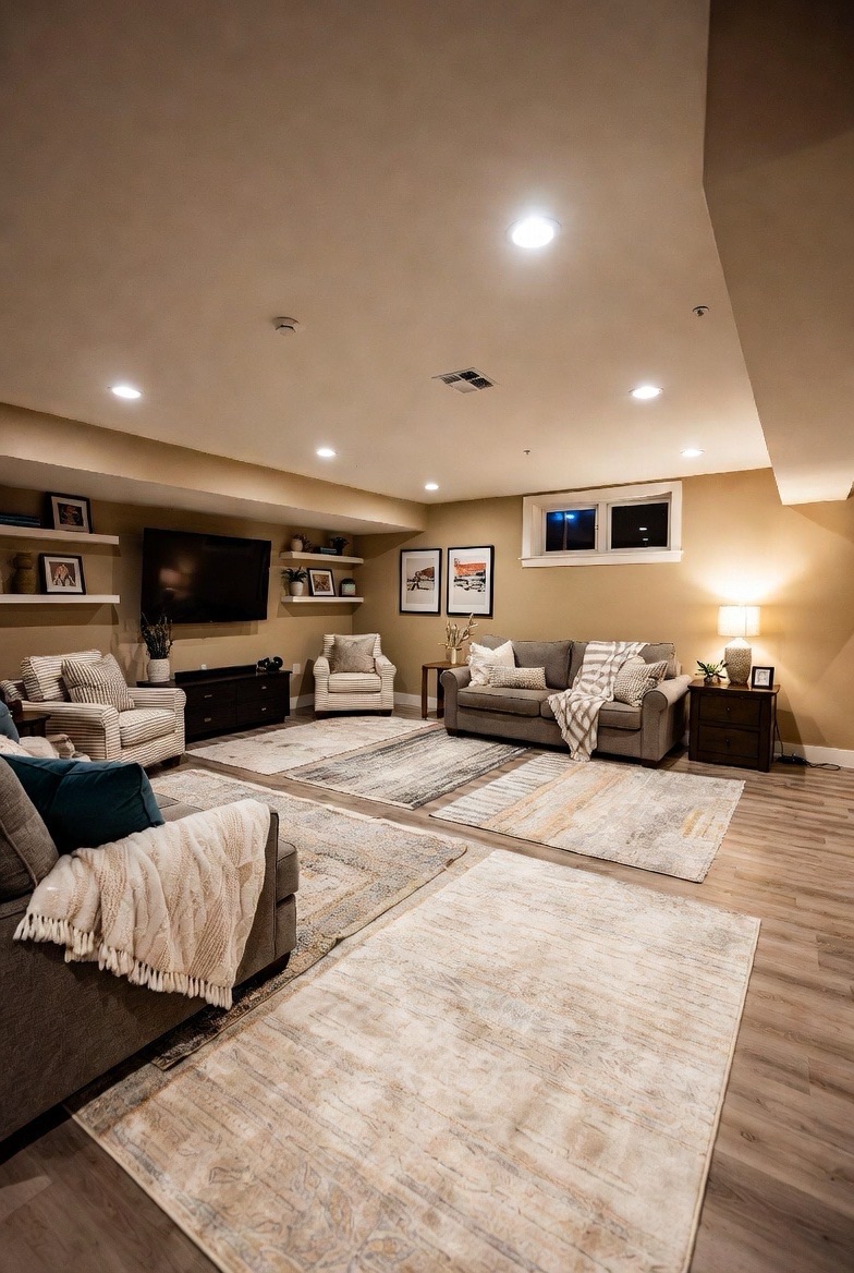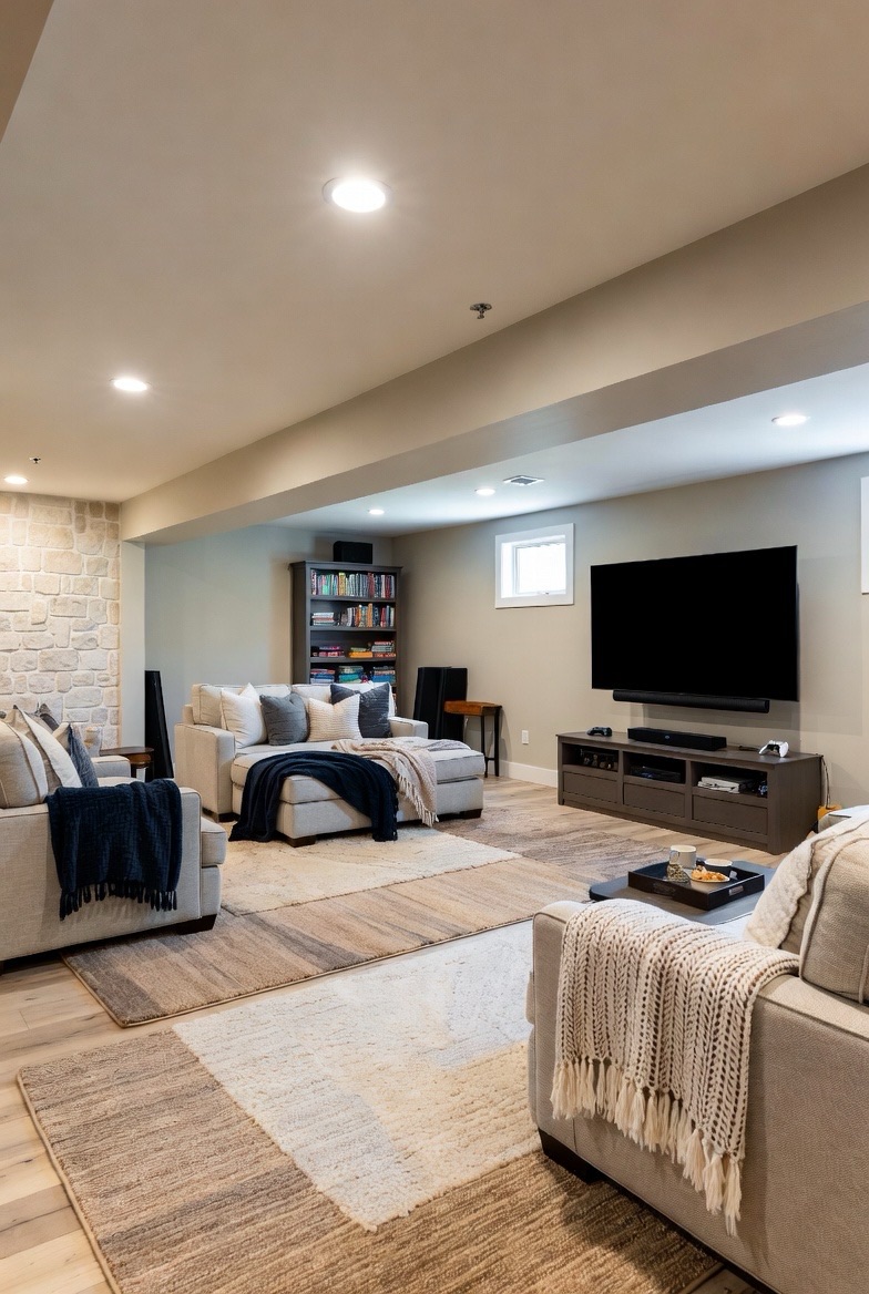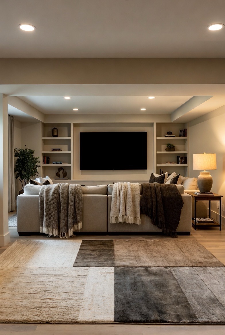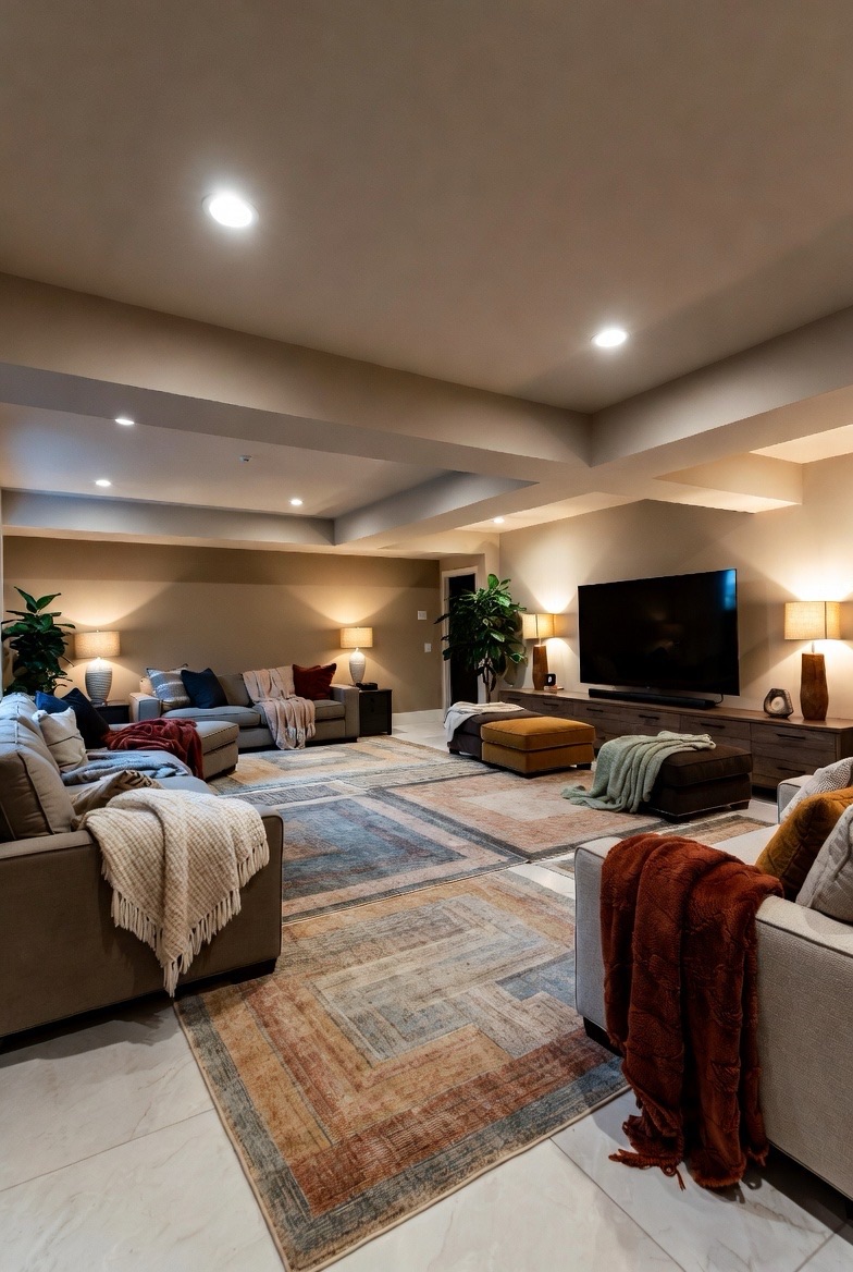 Design a warm, inviting family area with layered rugs, comfortable sectionals, and plenty of throw blankets. Neutral palettes paired with soft lighting make this space ideal for movie marathons or game nights.