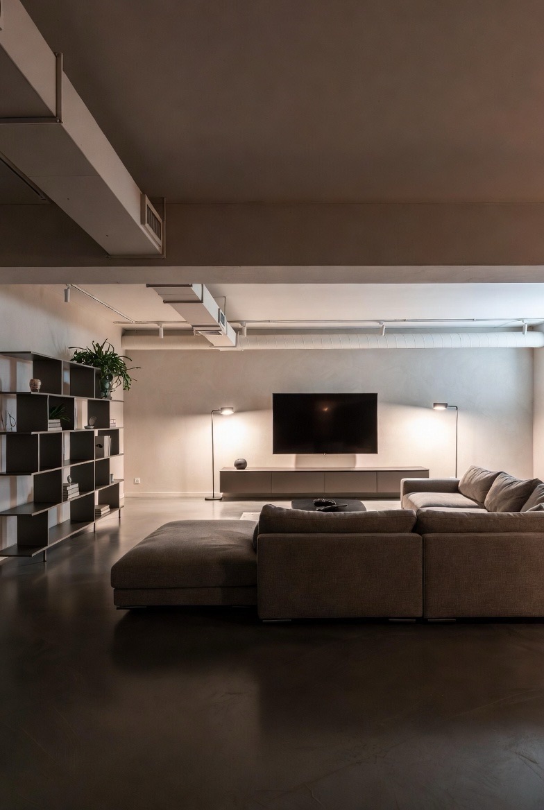 A minimalist lounge basement exudes tranquility with clean lines, neutral tones, and soft ambient lighting. Add a plush sectional sofa, sleek shelving, and a low-profile media console for a contemporary yet cozy vibe that invites relaxation and conversation.