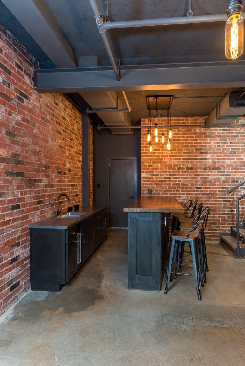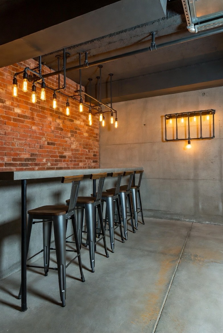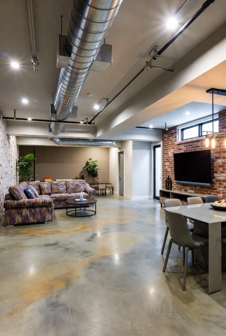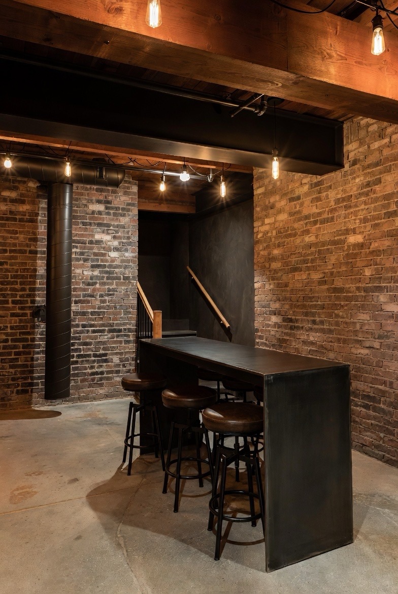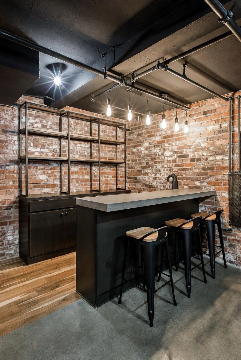 Exposed brick walls, matte black fixtures, and warm wood accents define an industrial-chic basement. Incorporate metal bar stools, concrete finishes, and Edison bulbs for a raw yet stylish atmosphere that feels effortlessly cool.