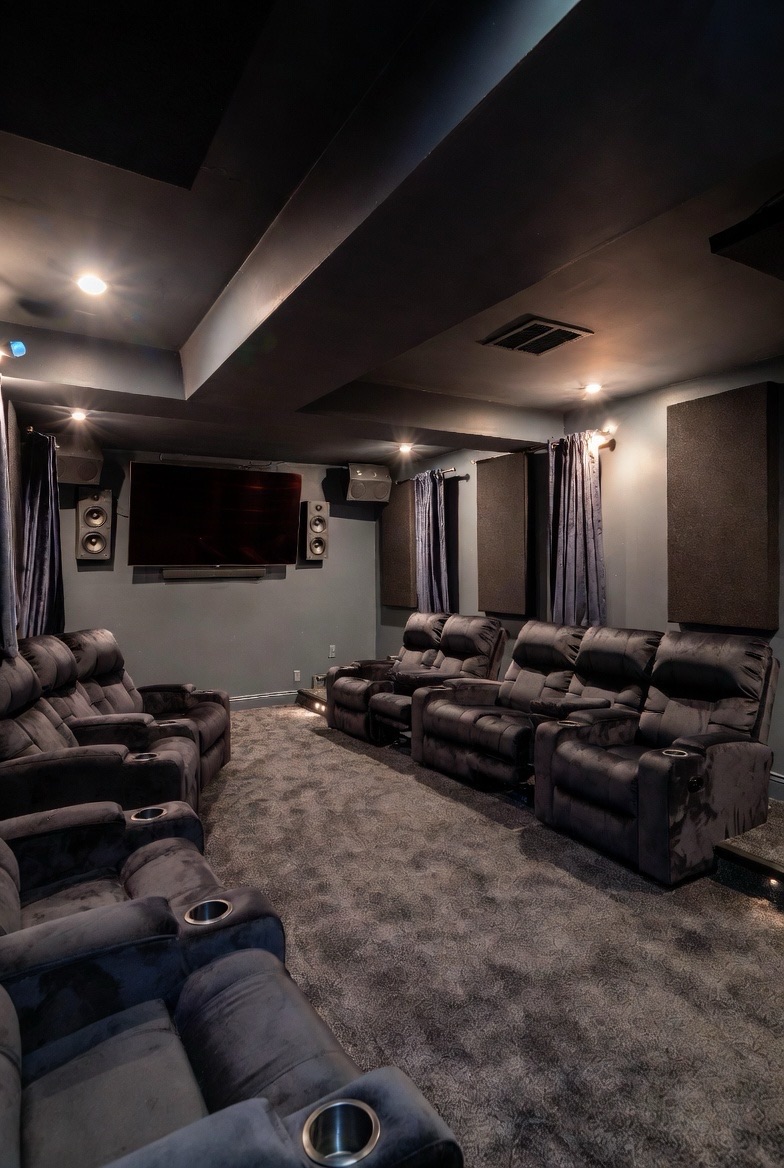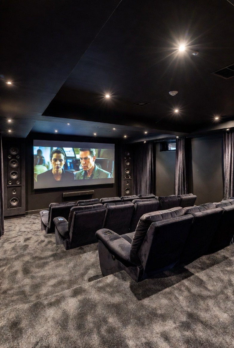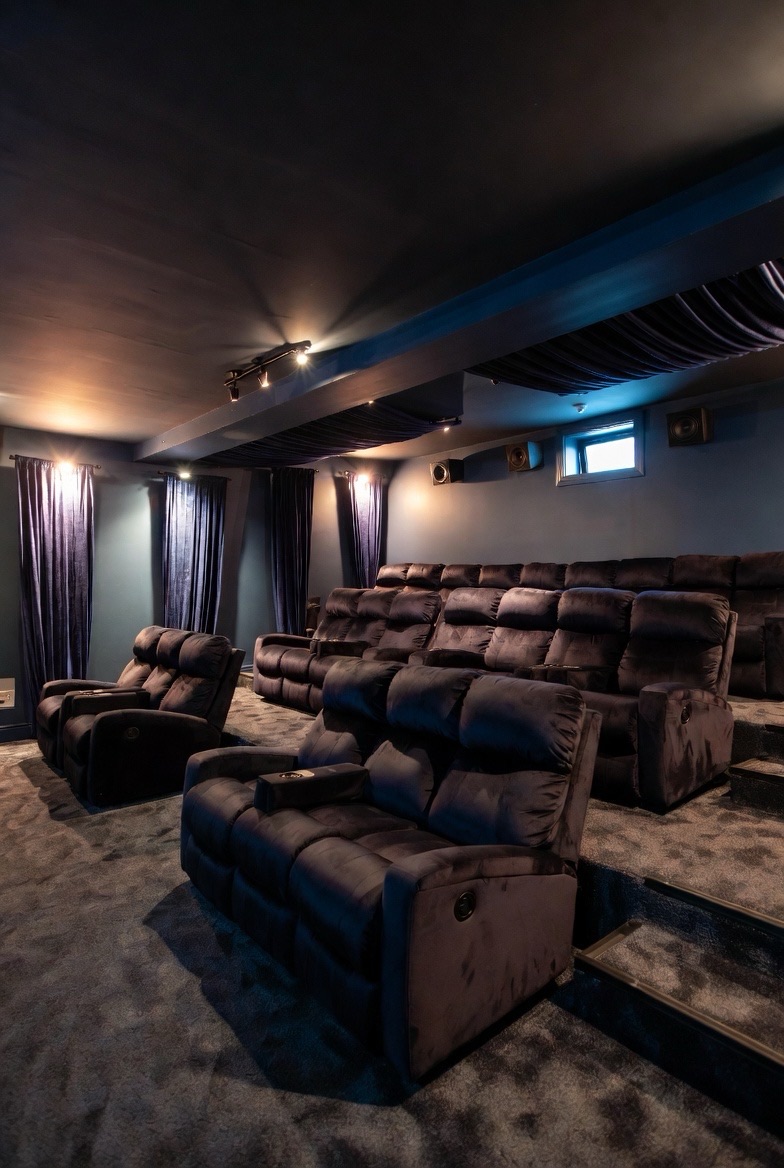 Transform your basement into a cinematic escape with tiered seating, surround sound, and dimmable LED lighting. Choose dark walls, velvet drapes, and plush recliners for a luxurious movie-night experience right at home.