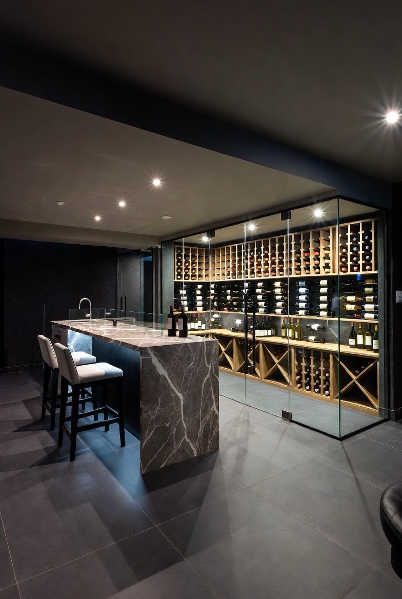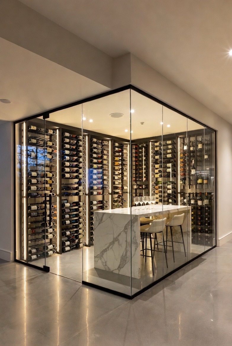 Combine function and sophistication with a glass-enclosed wine cellar and tasting area. Pair sleek glass racks with marble counters and accent lighting for an upscale, modern wine haven.