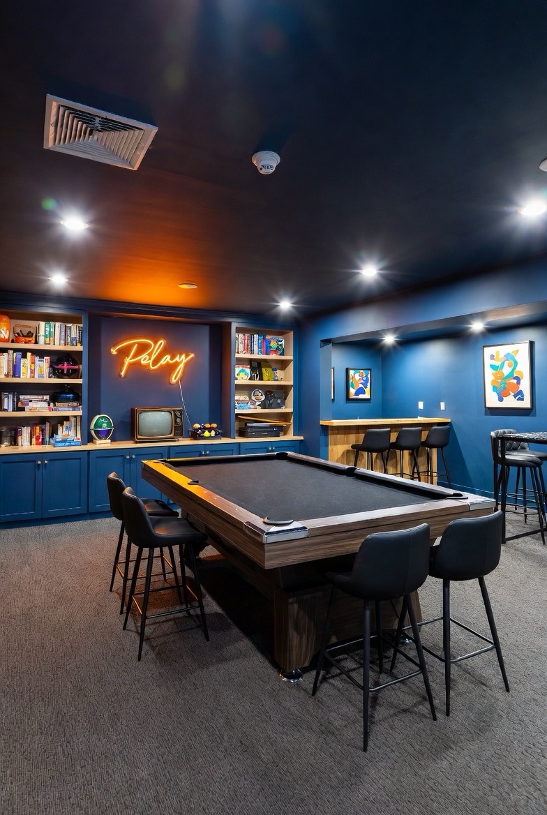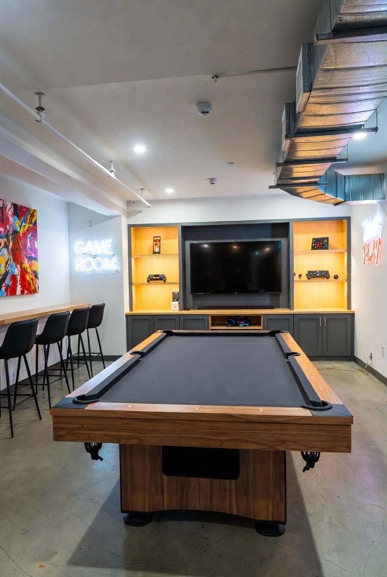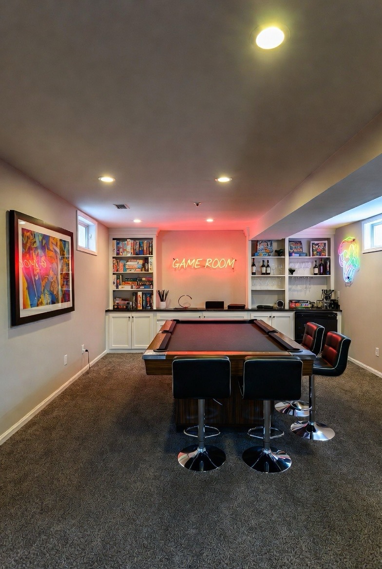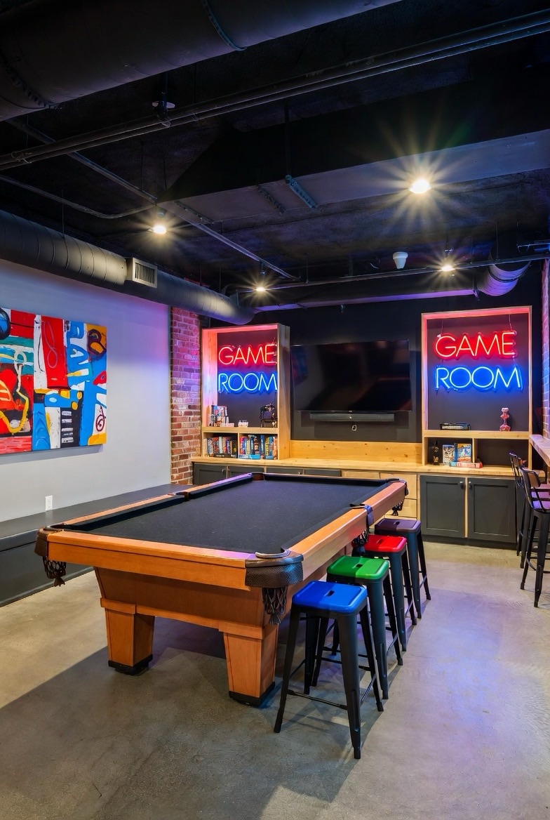 Create a fun and vibrant game zone featuring a pool table, neon signs, and custom built-ins. Add pops of color through modern art and sleek bar stools for a lively entertainment hub that wows.