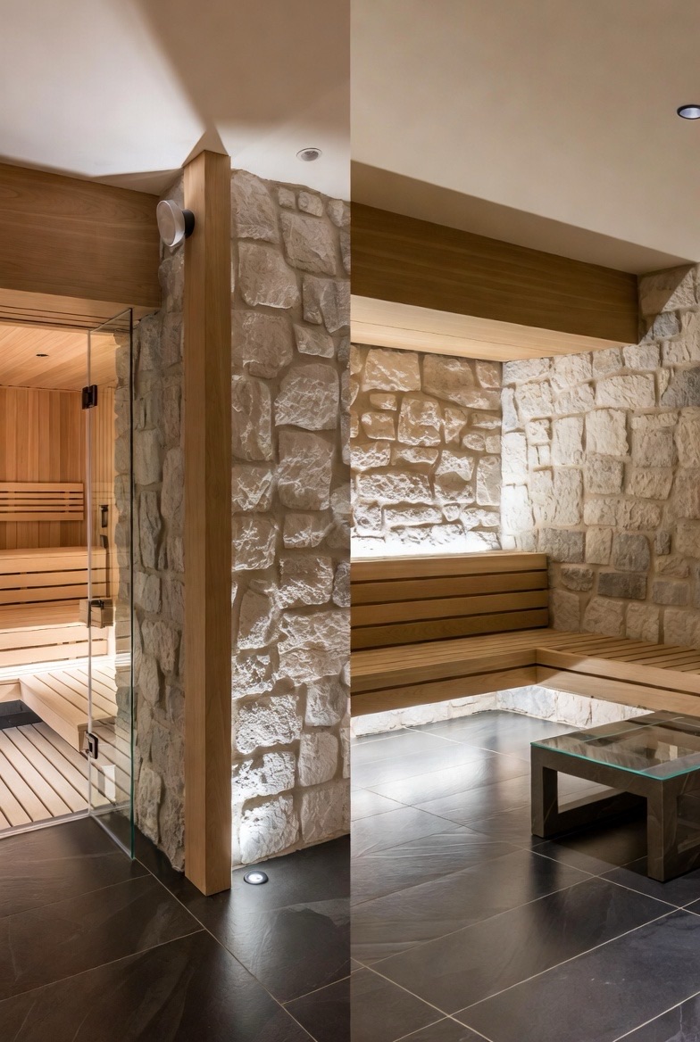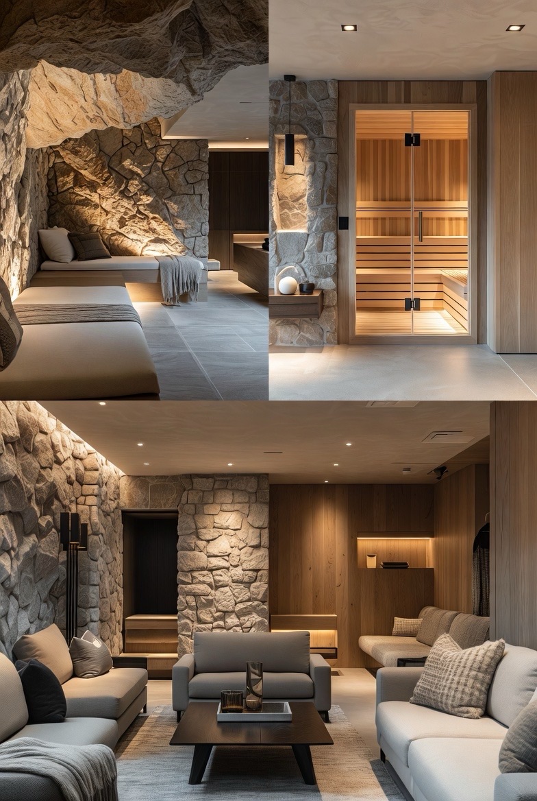 Bring wellness home with a spa-inspired basement featuring stone textures, a sauna, and soft lighting. Add natural wood accents and calming neutral hues for the ultimate relaxation zone.